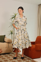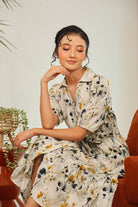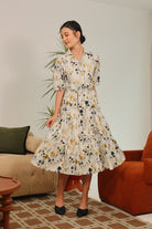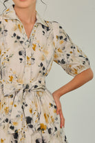 Step into timeless elegance with the Isolde Floral Shirt Dress, crafted from 100% cotton with full lining for breathable comfort. Designed with a flattering collared neckline, button-down front, and a removable self-tie sash that cinches the waist, this midi dress combines structure with flowy ease. The painterly floral print in golden yellow and charcoal tones adds a sophisticated charm, perfect for both weekday outings and weekend gatherings.