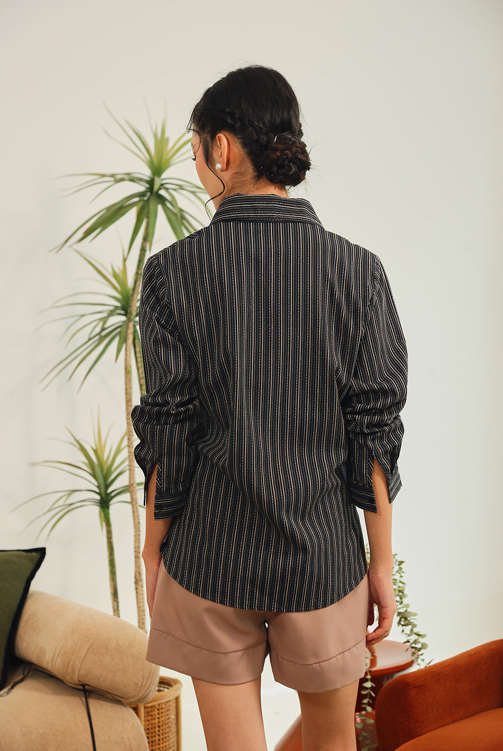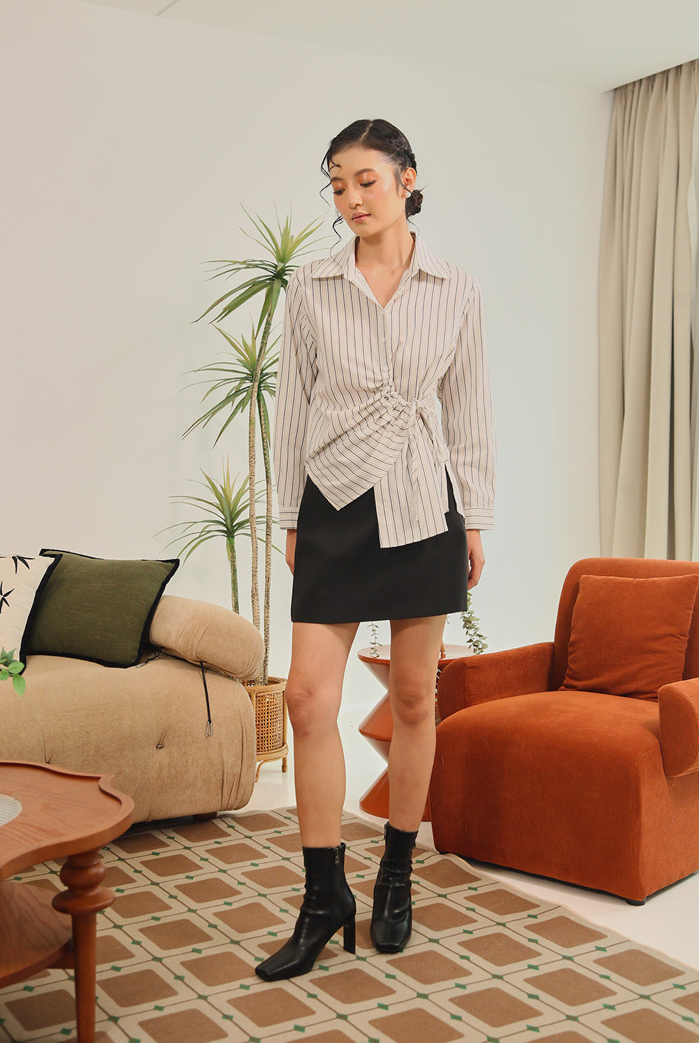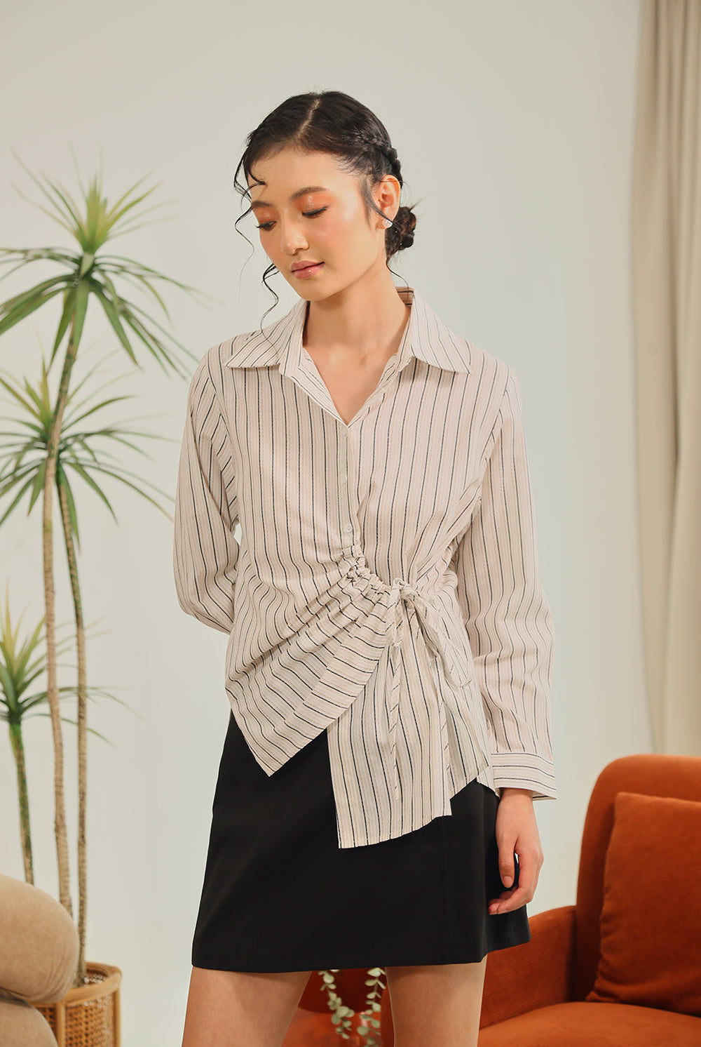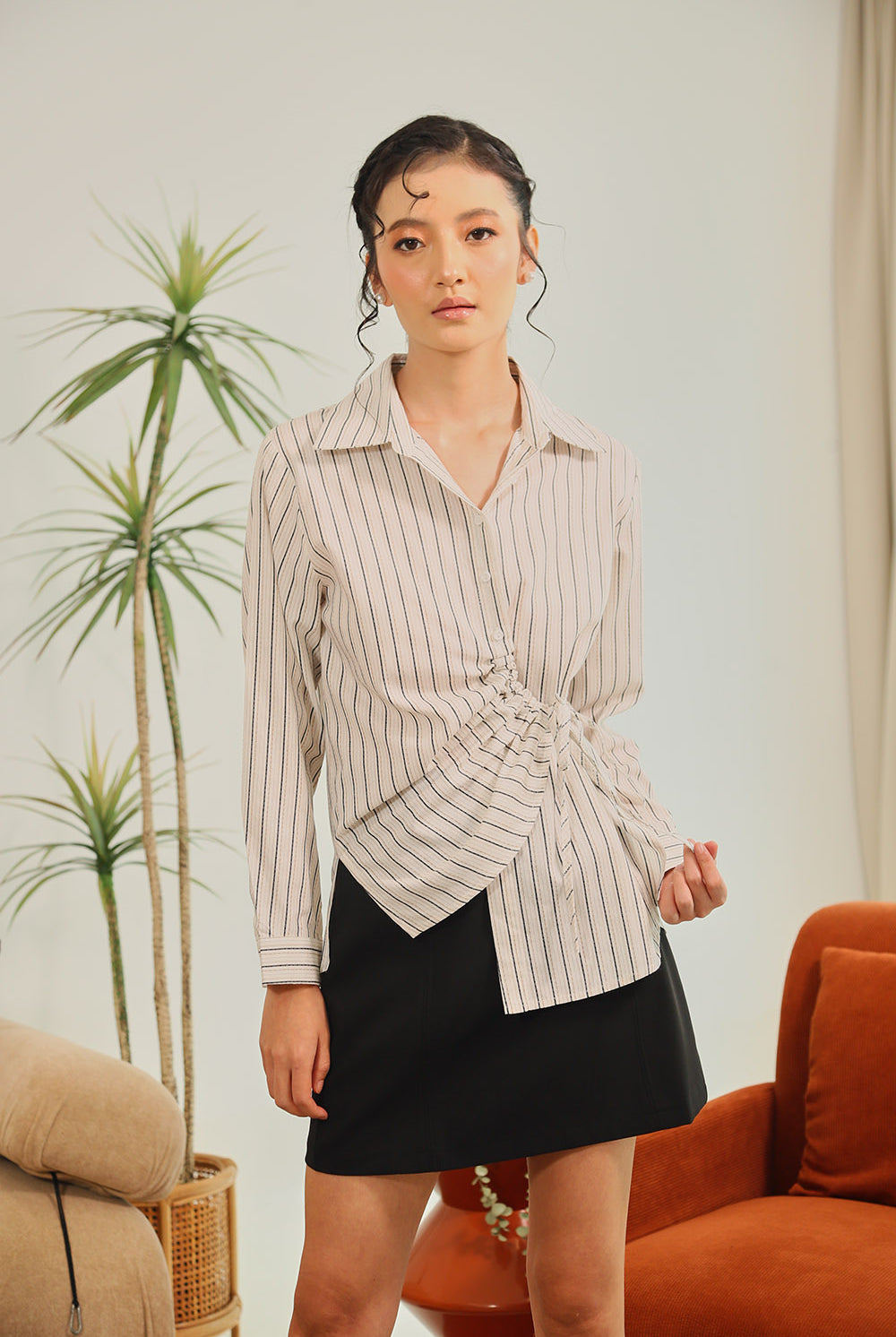 The Narela Ruched Stripe Shirt in White is a refreshing take on timeless stripes. Made from 100% breathable cotton, this shirt features a modern ruched detail with adjustable side ties that add both structure and fluidity to your look. The clean stripe pattern elevates everyday styling, making it versatile for both office days and city strolls.