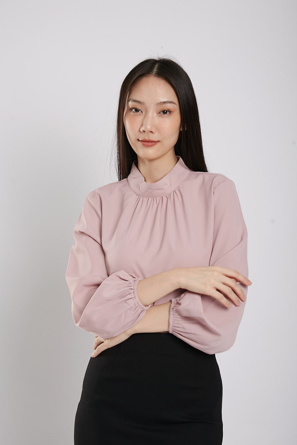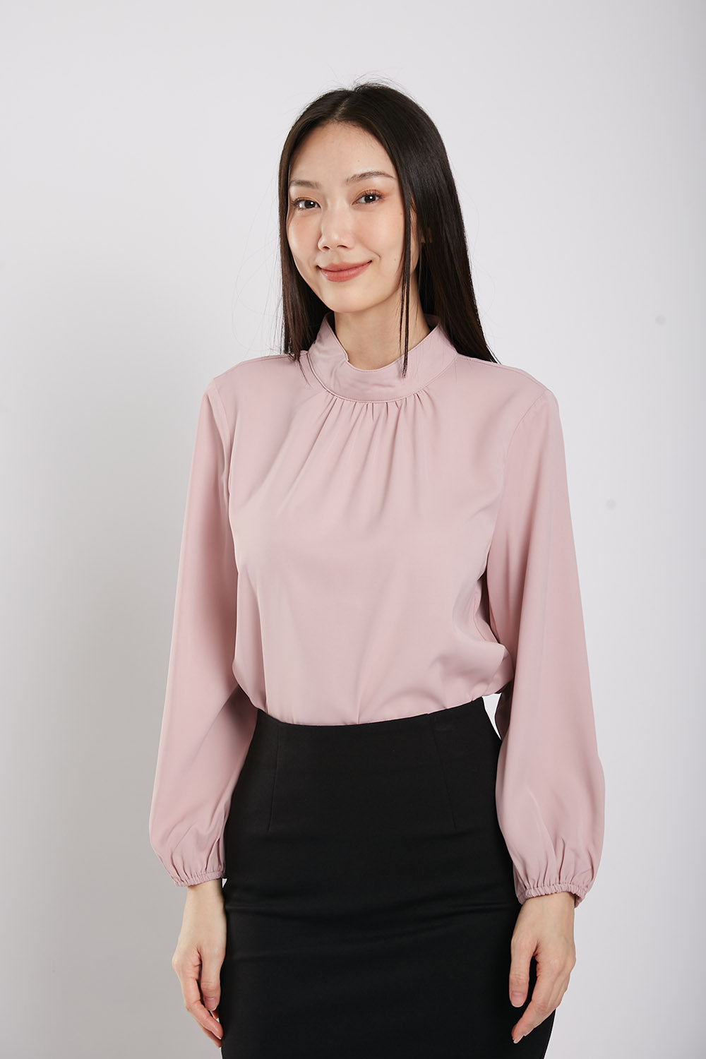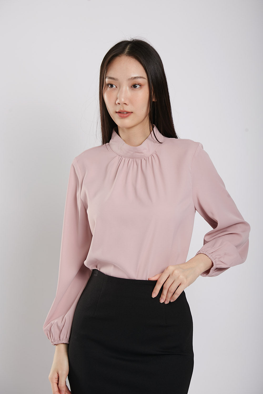 The Astie Blouse features a round neckline and long puffy sleeves with elastic cuffs for added comfort. The easy iron fabric makes for effortless maintenance while the ruched detail around the neckline adds a touch of elegance. Complete with a back button closure, this blouse is the perfect addition to any wardrobe.