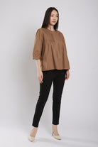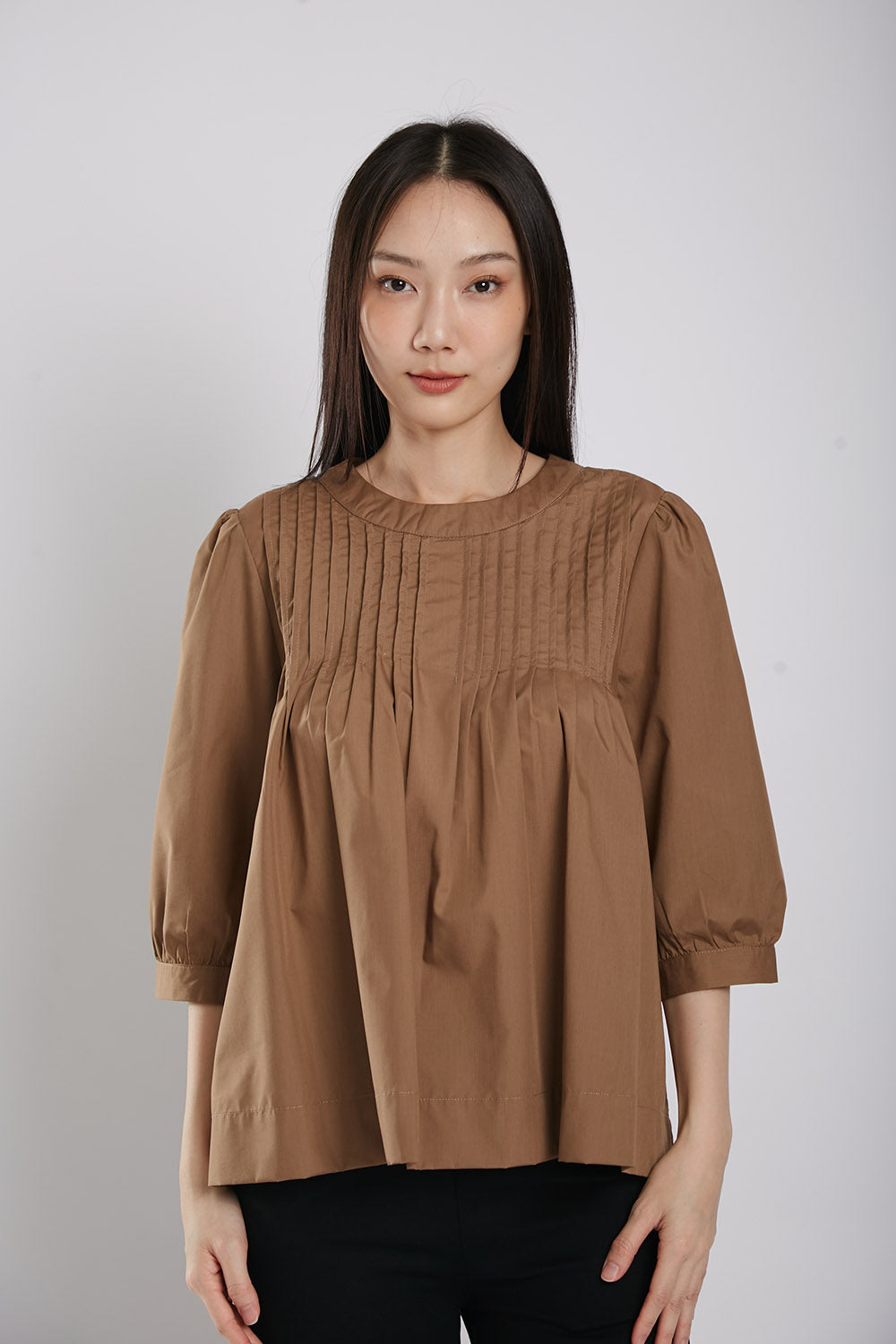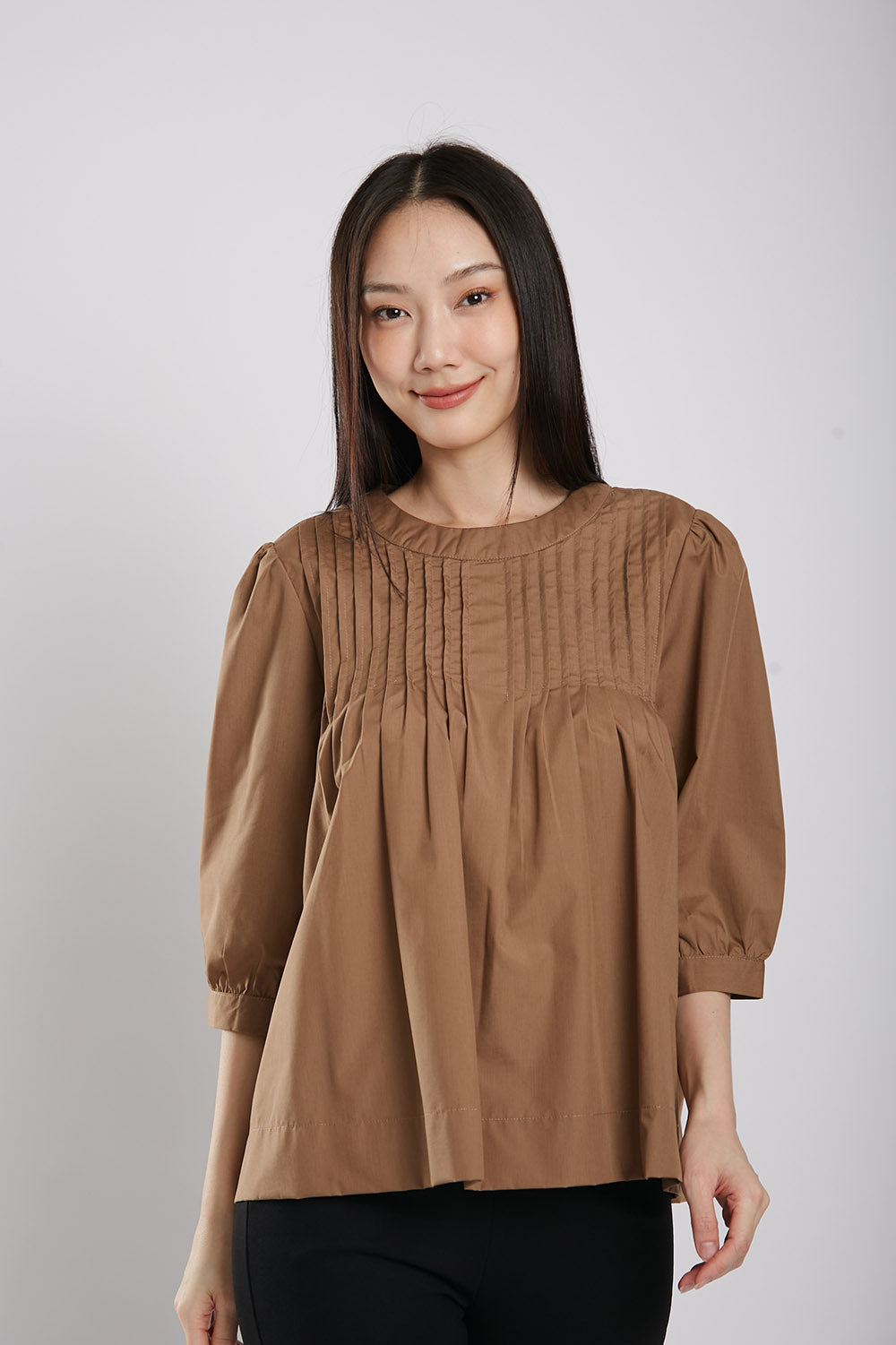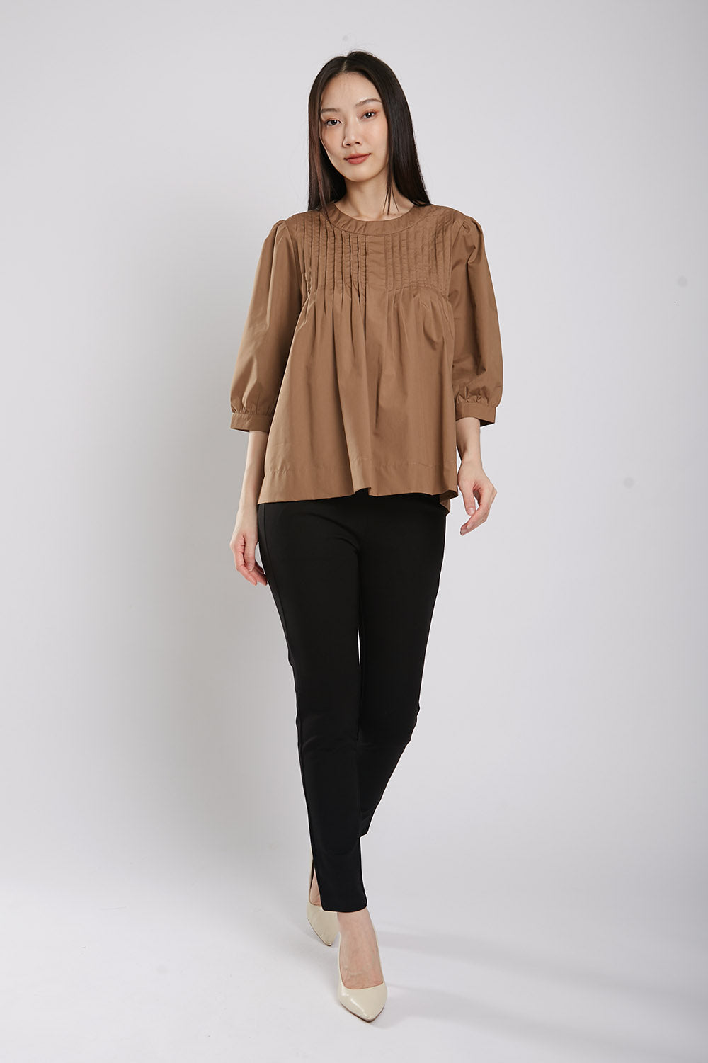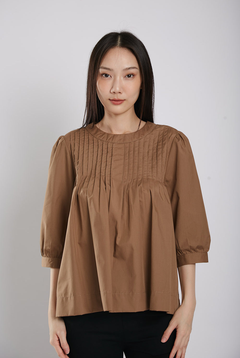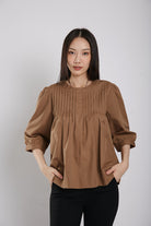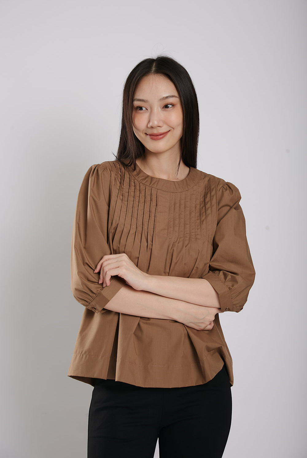 Expertly crafted from a soft cotton blend fabric, the Brienne Blouse in White is the perfect addition to your wardrobe. The front pleated detailing adds a touch of elegance, while the back button closure ensures a secure fit. Stay comfortable and stylish all day long with this versatile blouse.