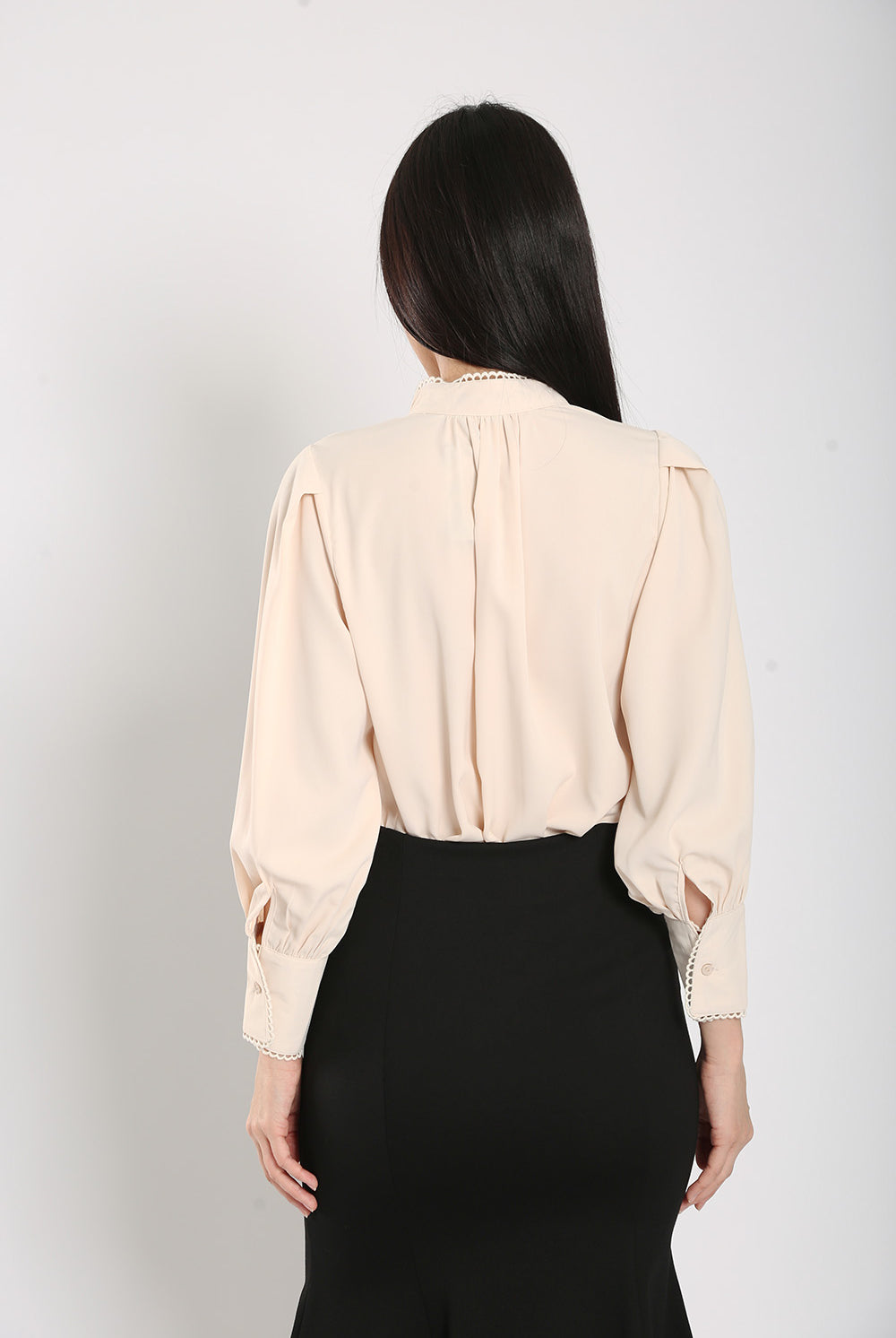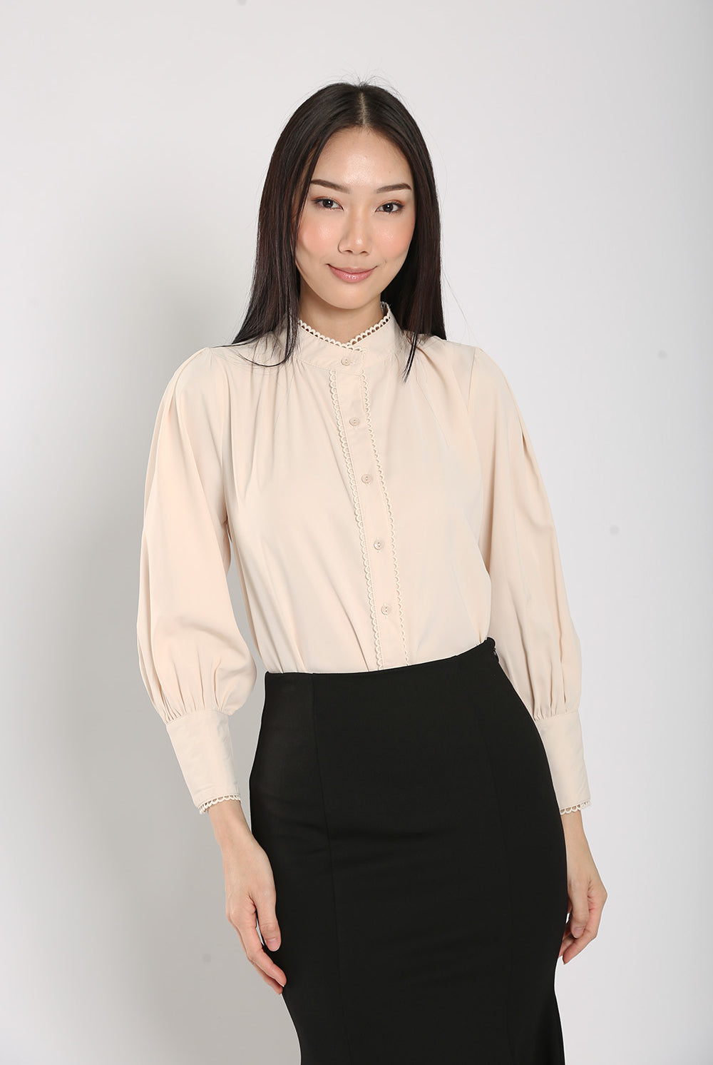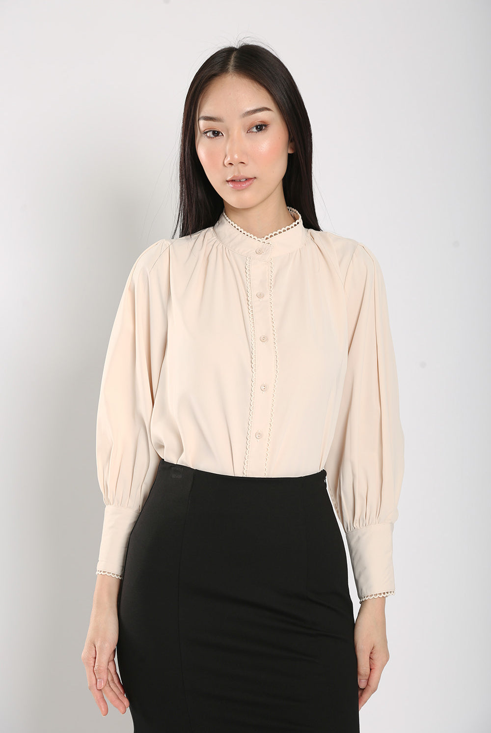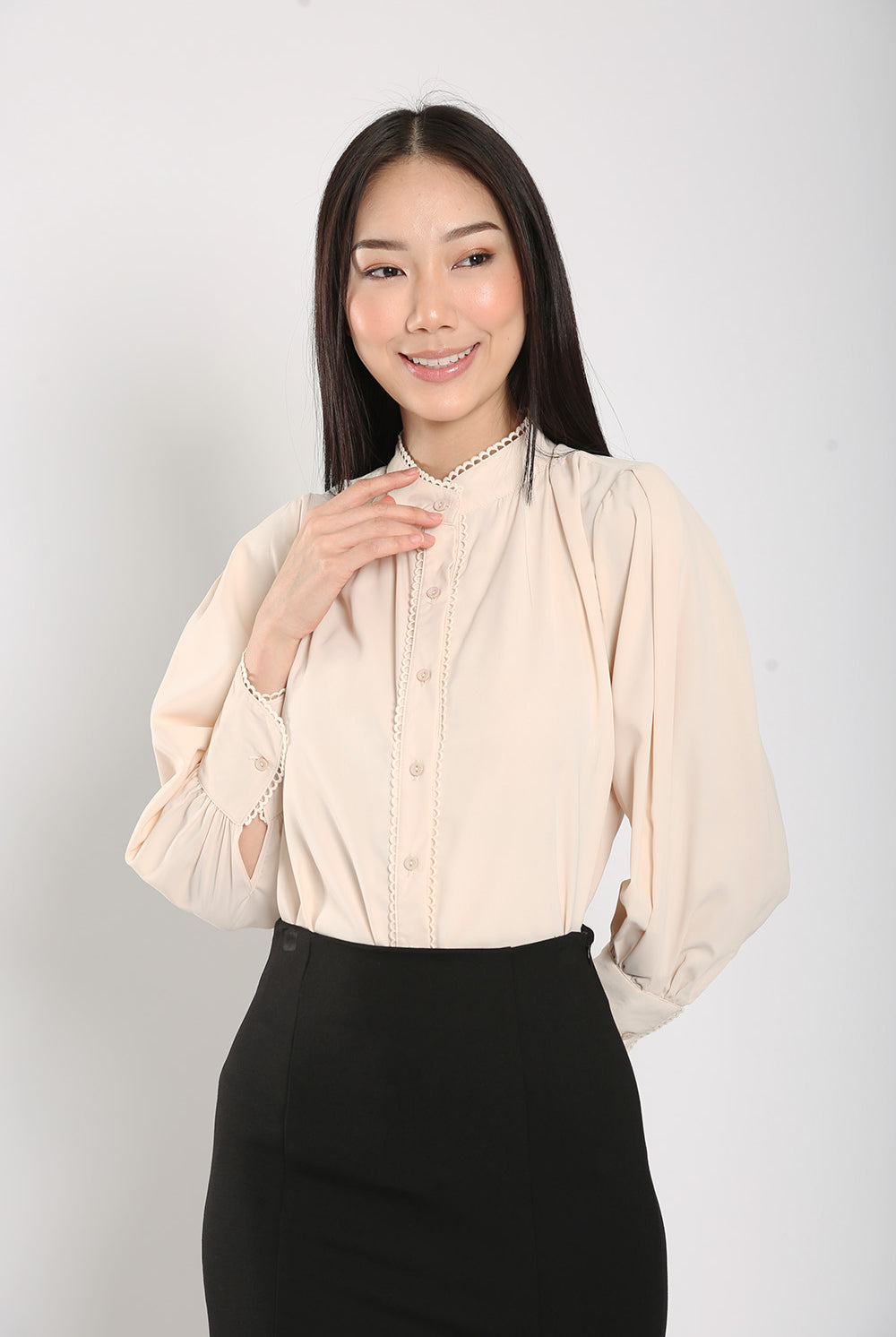 The Rasha Blouse in Apricot features a front pearl button closure and non-lined design, accented with delicate crochet trimmings. Crafted from a polyester cotton blend material, this blouse offers a non-stretchable fit and luxurious feel.