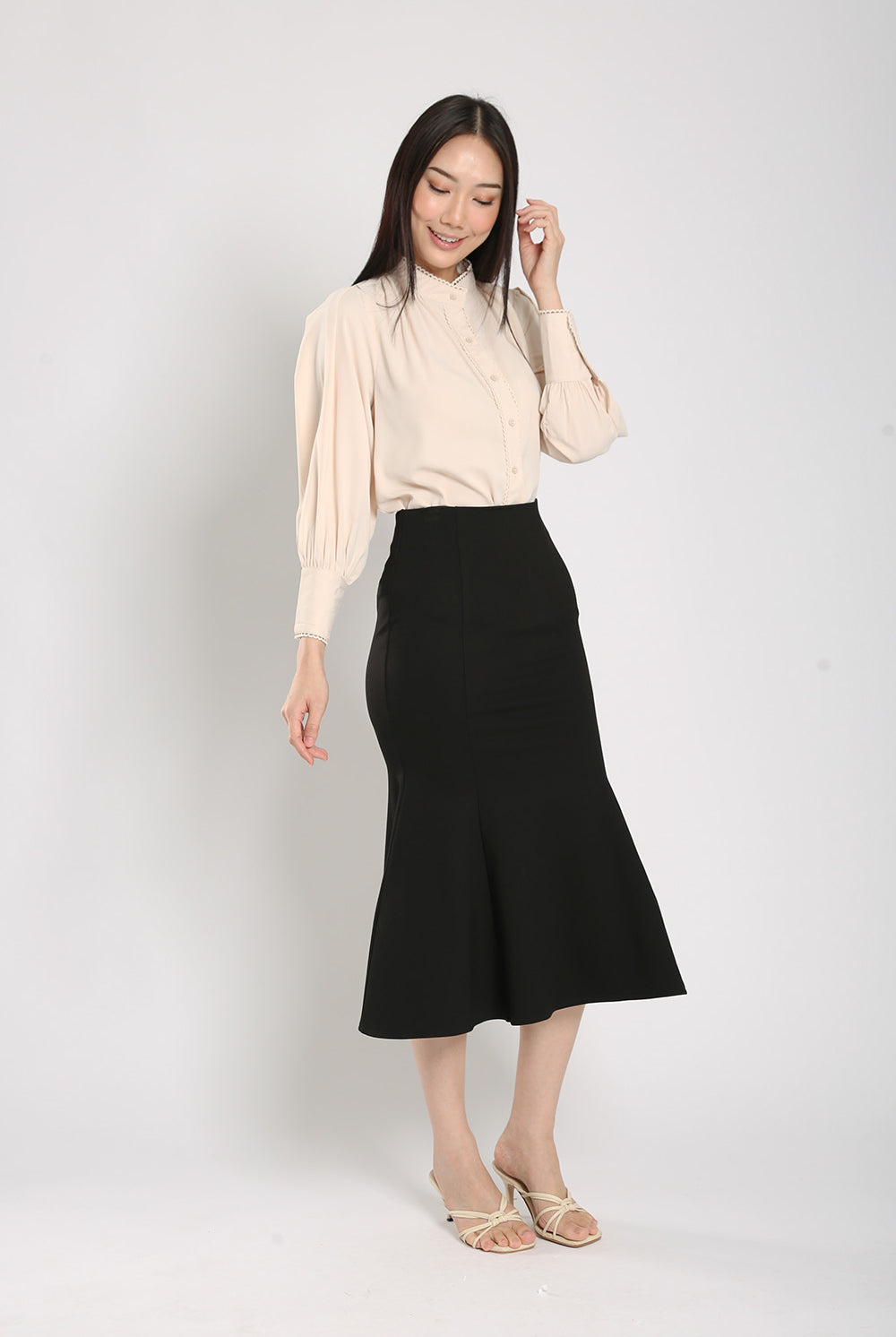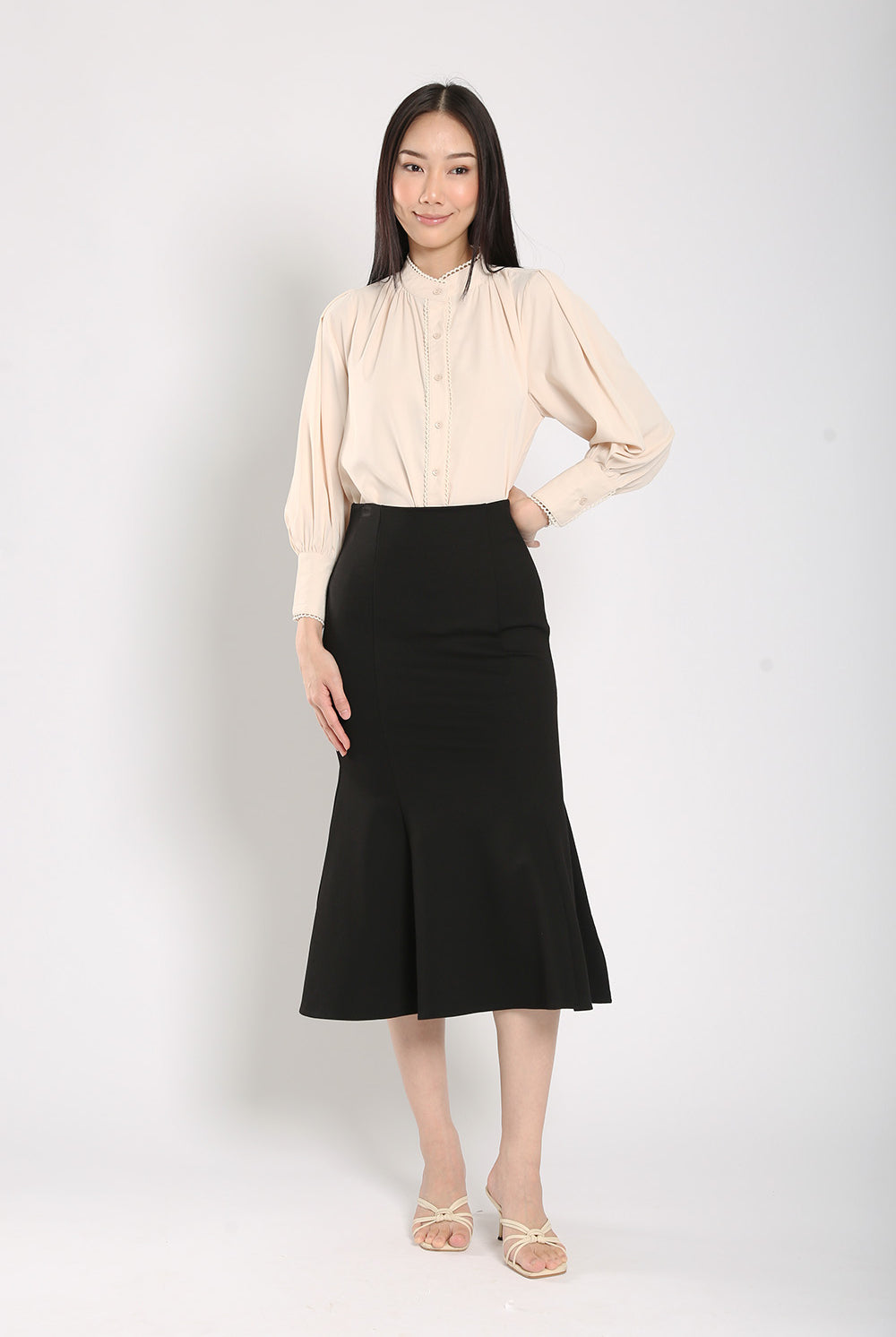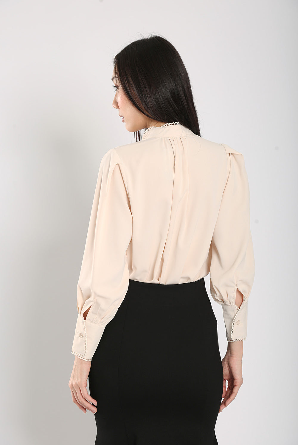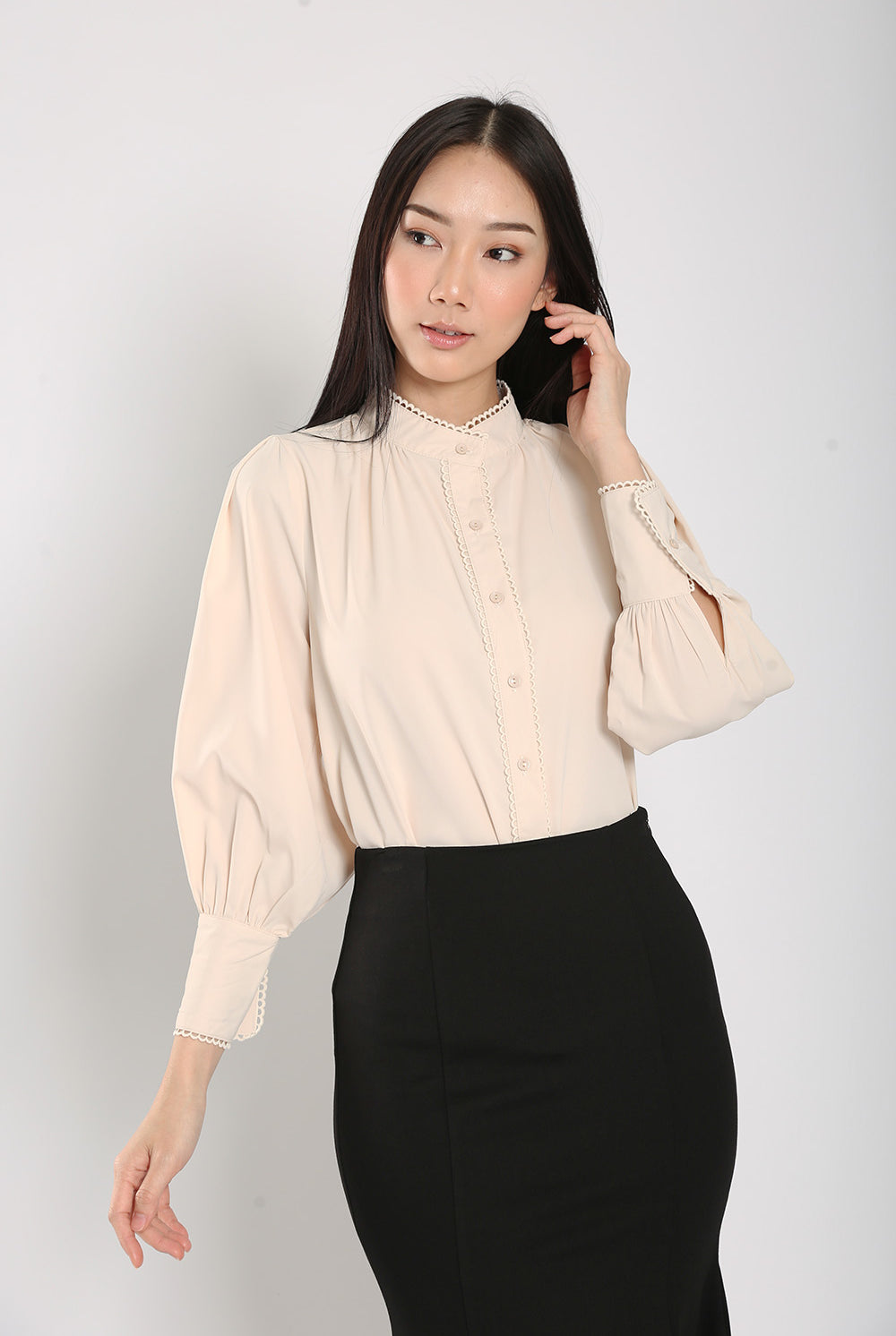 The Rasha Blouse in Apricot features a front pearl button closure and non-lined design, accented with delicate crochet trimmings. Crafted from a polyester cotton blend material, this blouse offers a non-stretchable fit and luxurious feel.