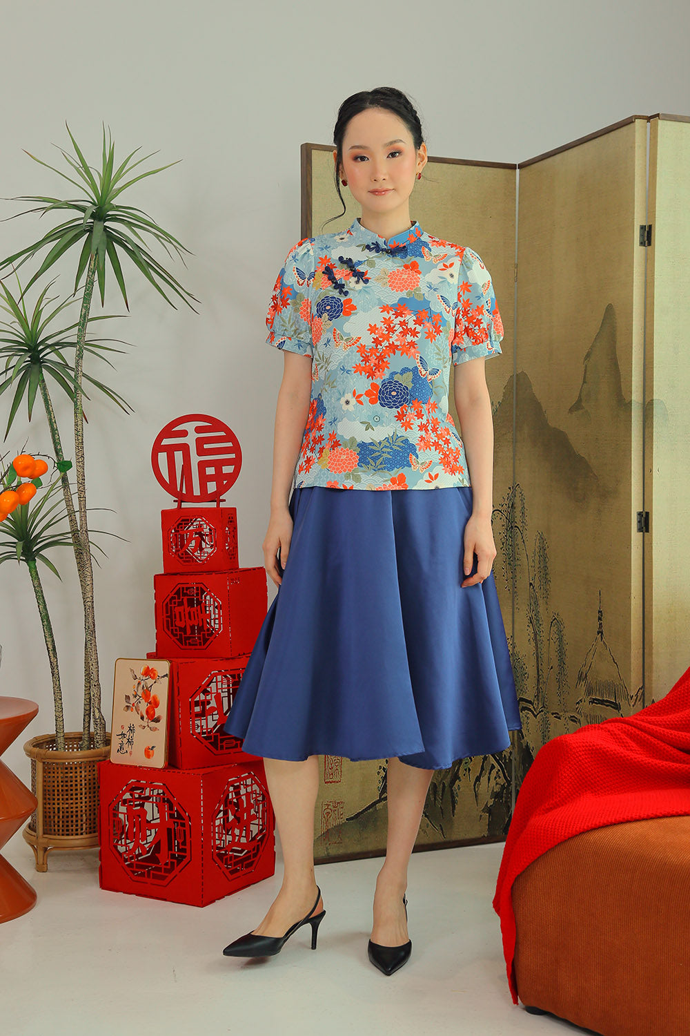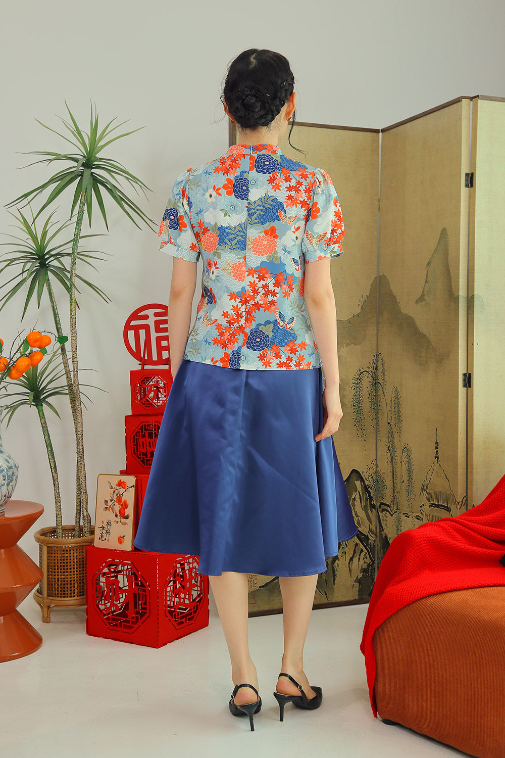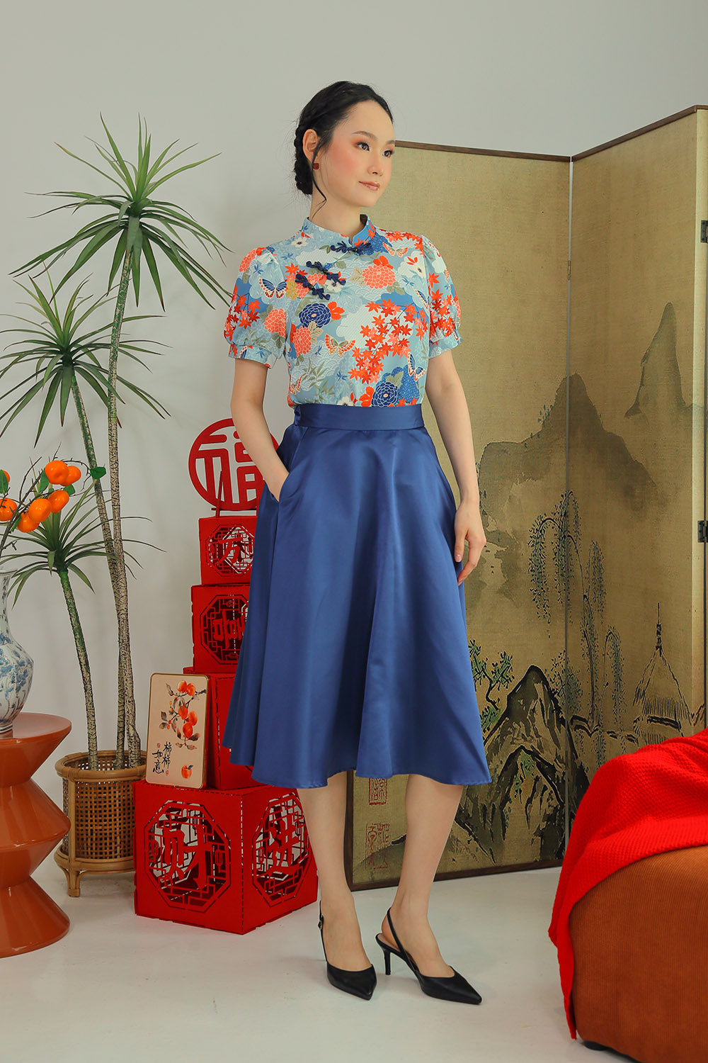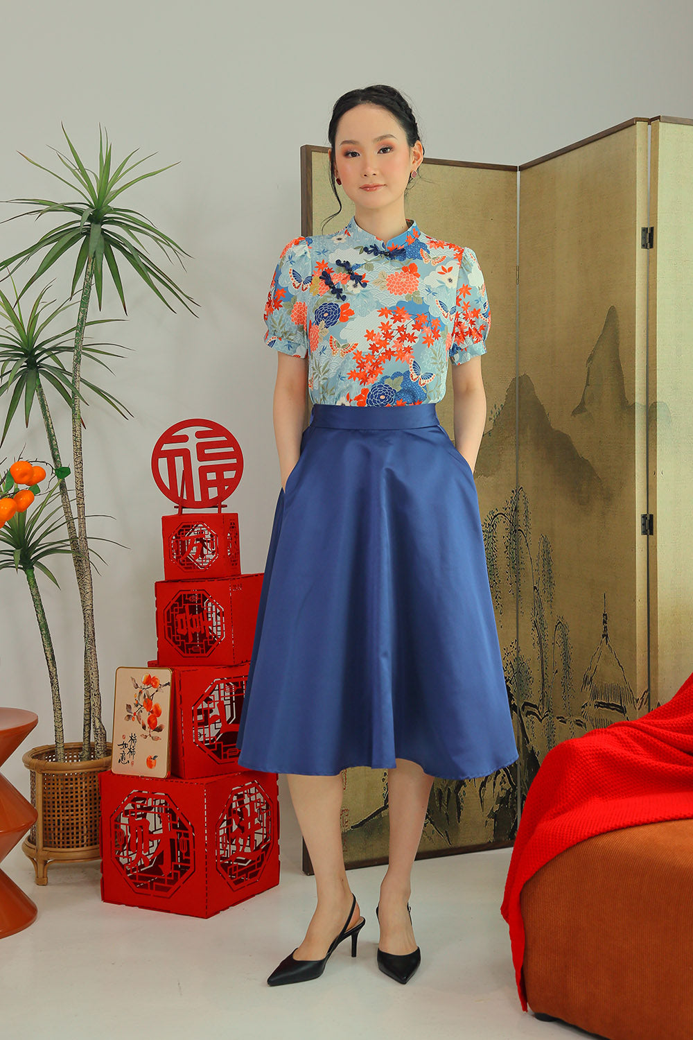 The Elowen Midi Skirt is a celebration of timeless elegance, featuring a stunning black floral print and a flattering A-line silhouette. Designed with functionality and comfort in mind, it includes a back elasticized band, back zip closure, and convenient side pockets. Its graceful flow and premium craftsmanship make it a versatile choice for any occasion. Pair it effortlessly with the Laurine Mandarin Collar Top in Red for a sophisticated ensemble that transitions seamlessly from day to evening. A wardrobe staple designed for comfort, style, and modern charm.