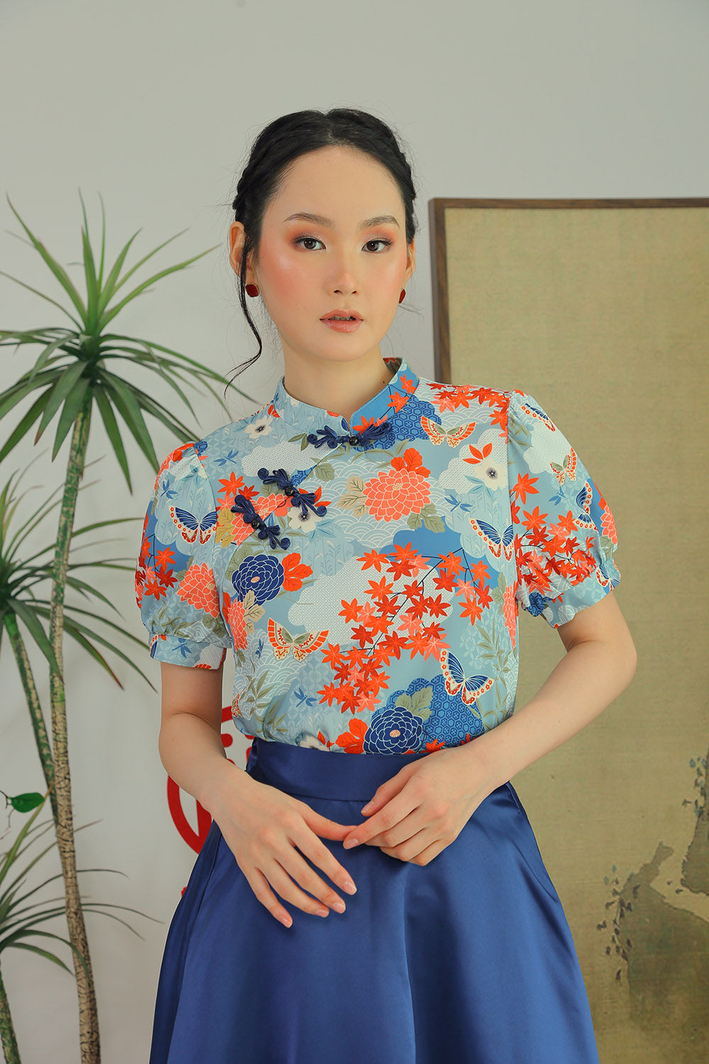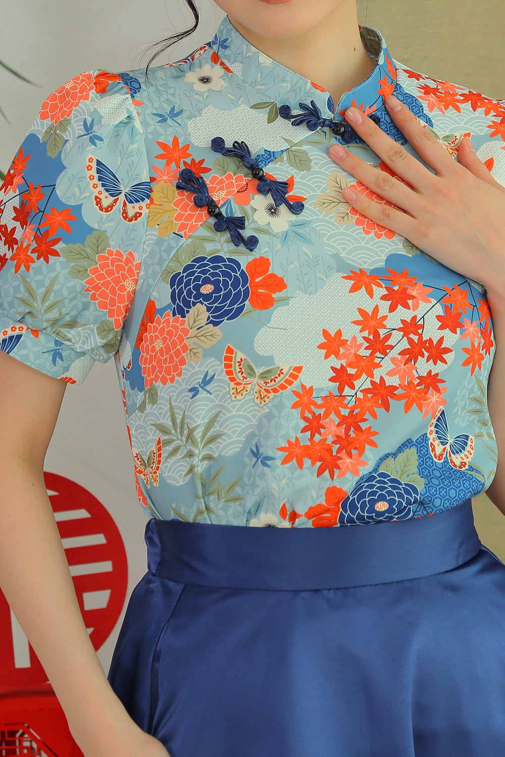 Crafted from smooth, quality polyester, the fabric offers a polished drape with a soft, comfortable finish. The mandarin collar and jade-style knot buttons lend a classic cheongsam touch, while the subtle puff sleeves add gentle structure for a flattering, feminine silhouette.