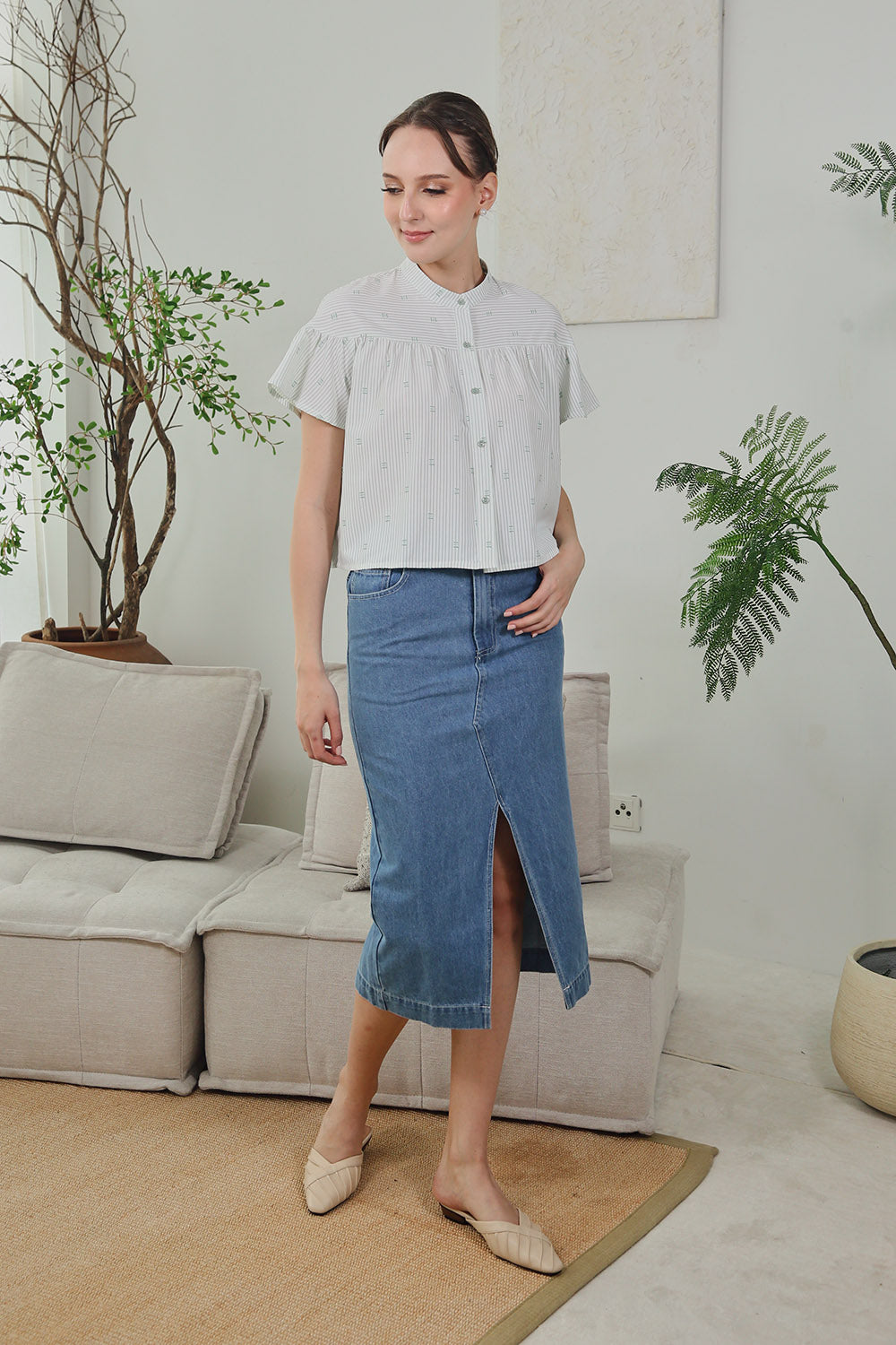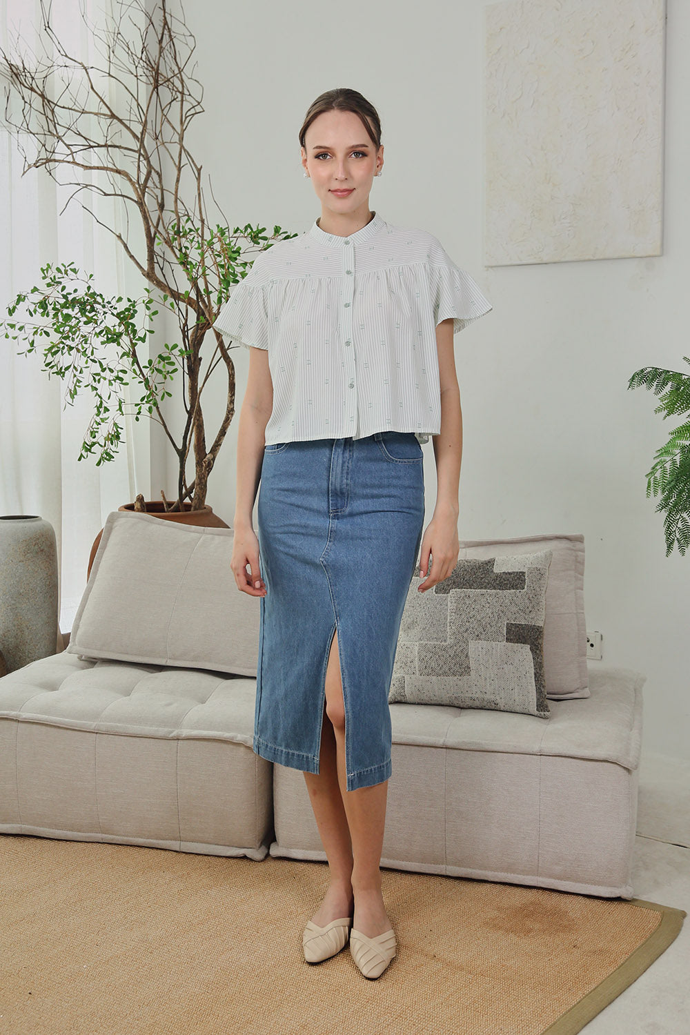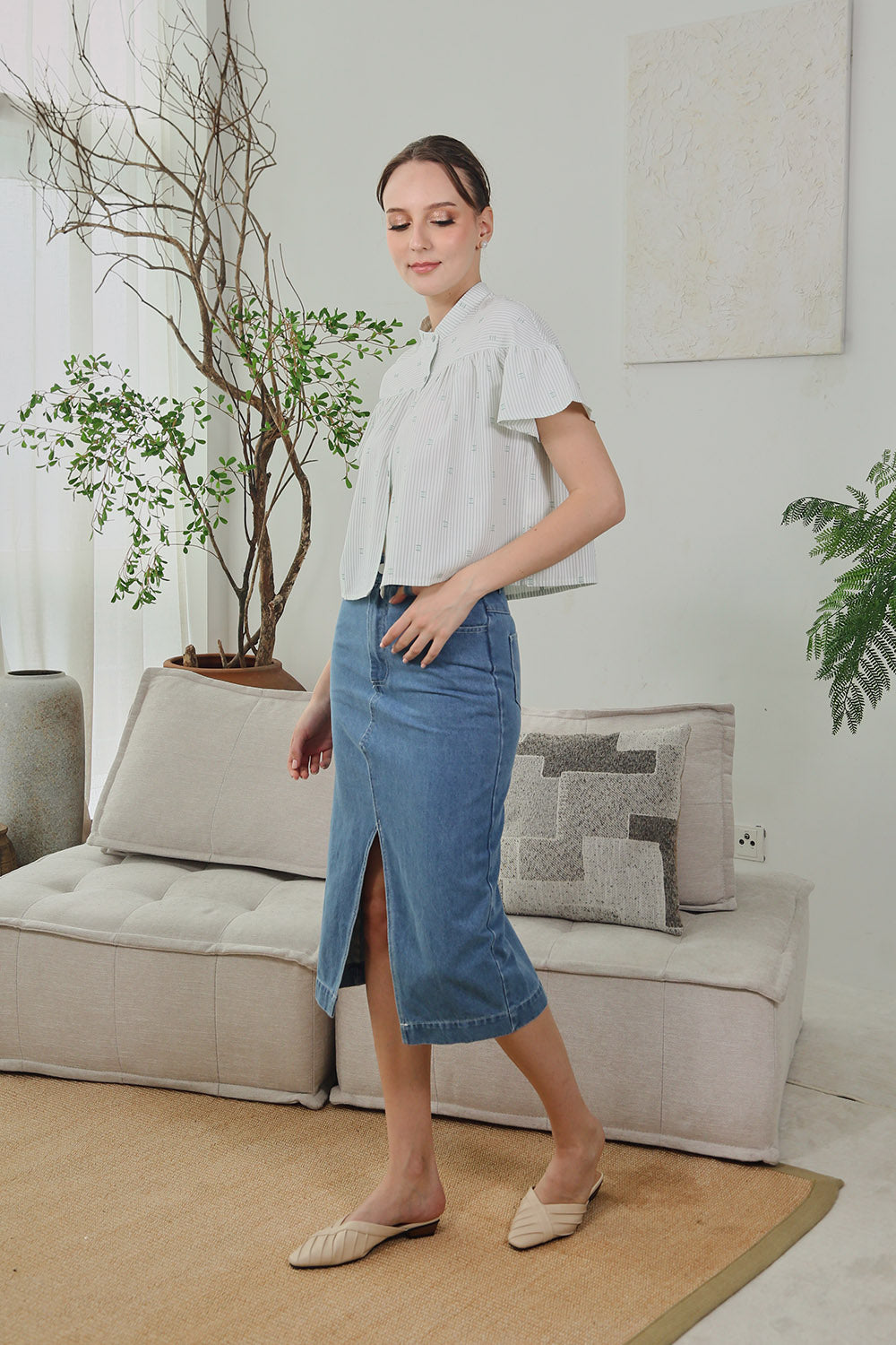Timeless with a modern twist — the Aubrie Skirt redefines denim classics with its clean silhouette and front slit detail. Crafted from mid-weight denim with just the right structure, this midi skirt features a flattering high waist, functional pockets, and a centre-front slit for ease of movement and style.