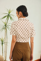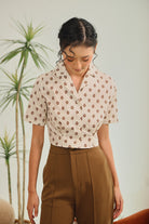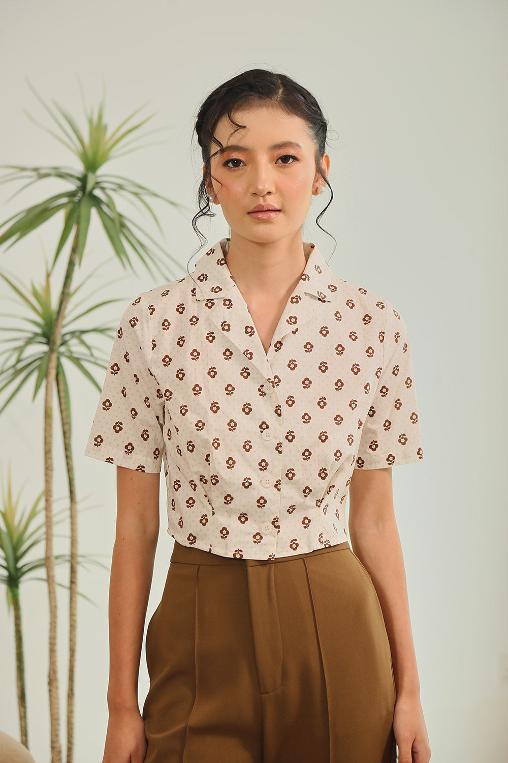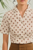 Crafted from 100% premium cotton, the Clarisse Blouse is a timeless piece with a charming petite floral print in earthy brown tones. Designed with a smart collared neckline and button-down front, this blouse combines comfort with classic sophistication. Its breathable cotton fabric ensures all-day ease, while the cropped cut adds a modern touch for versatile styling.