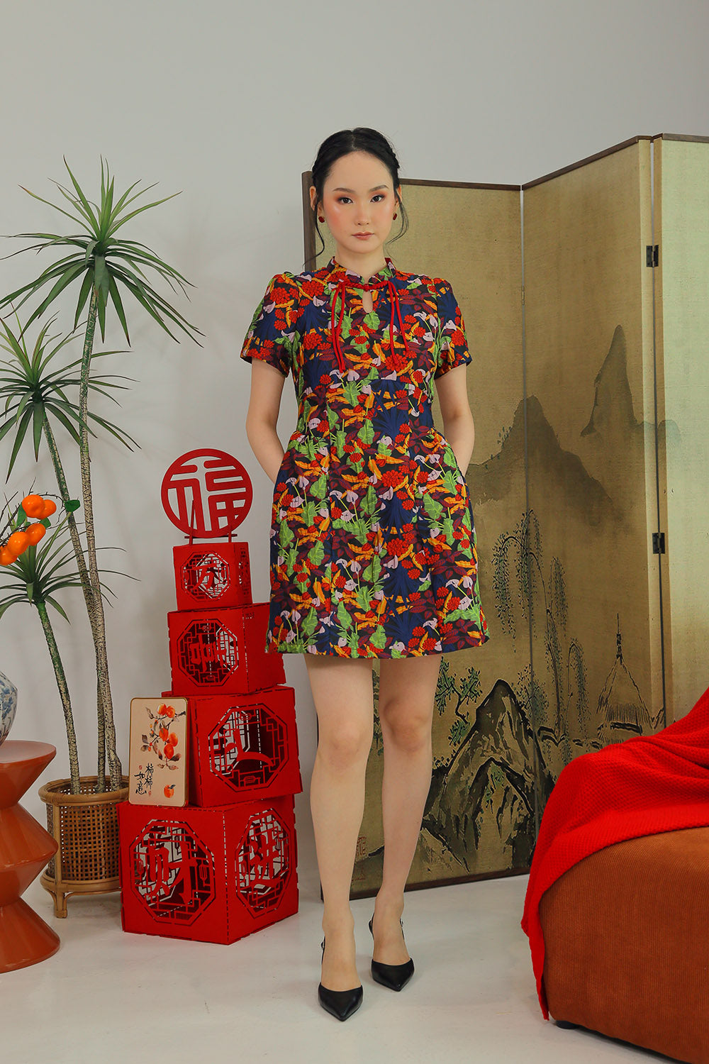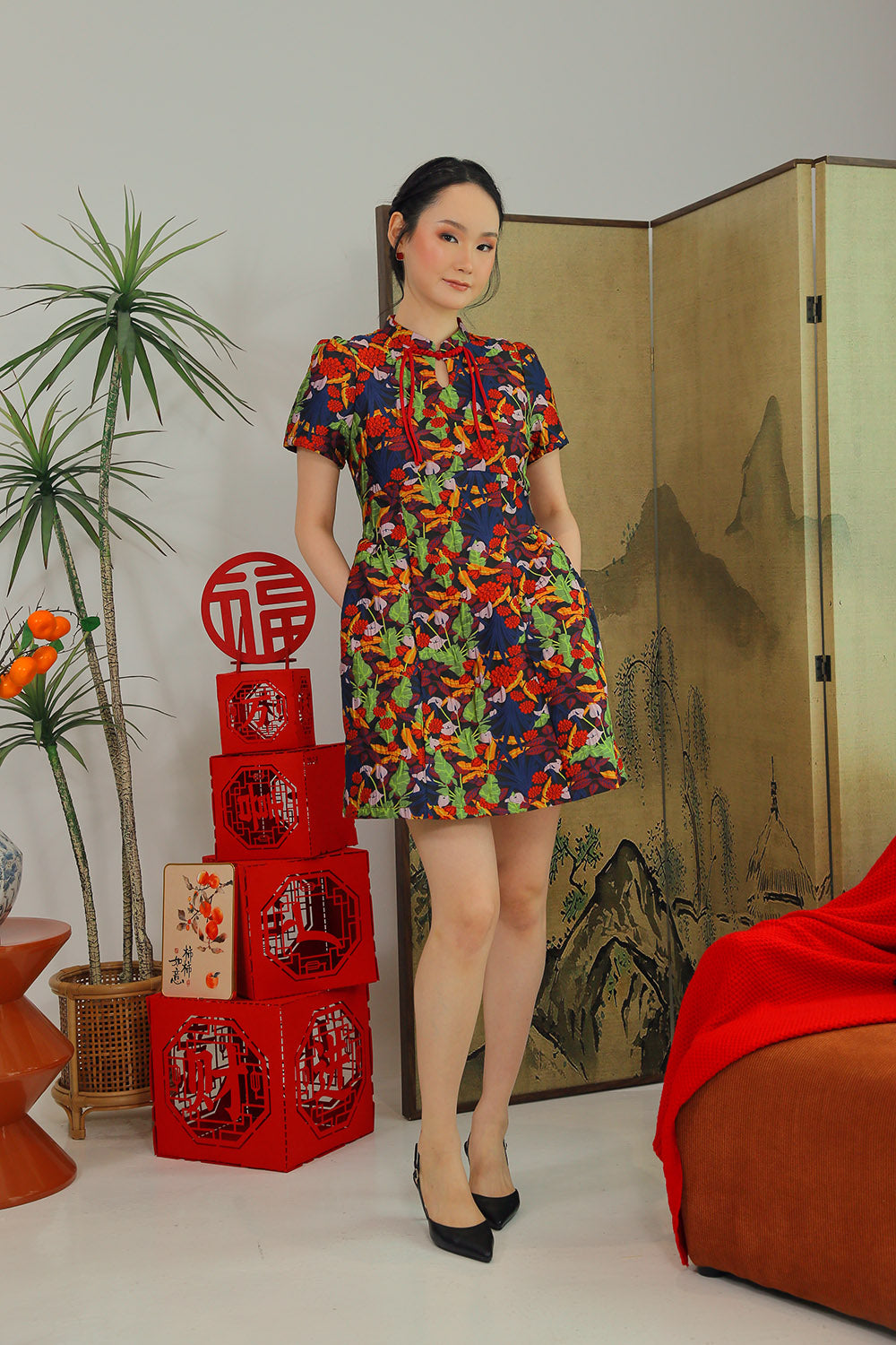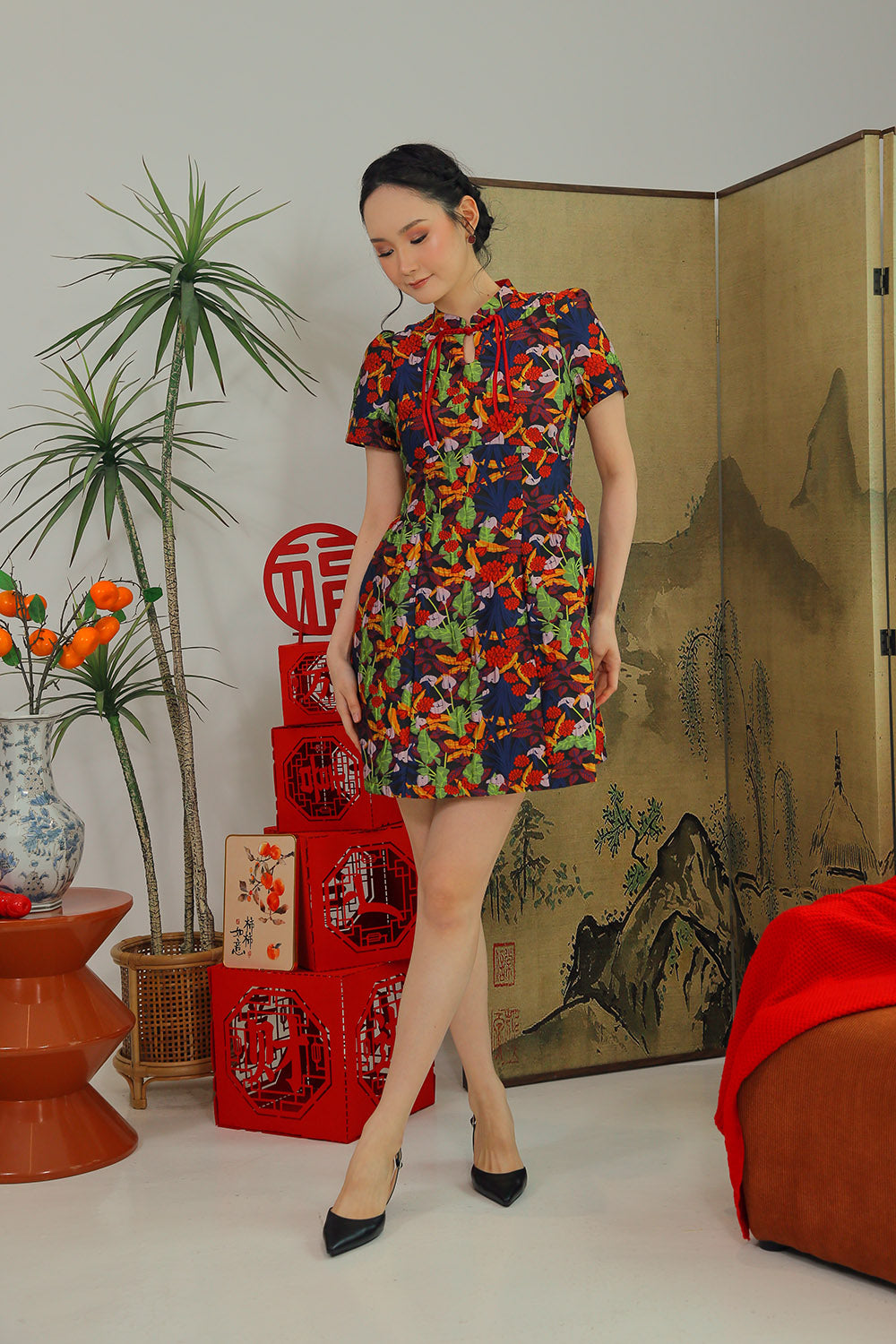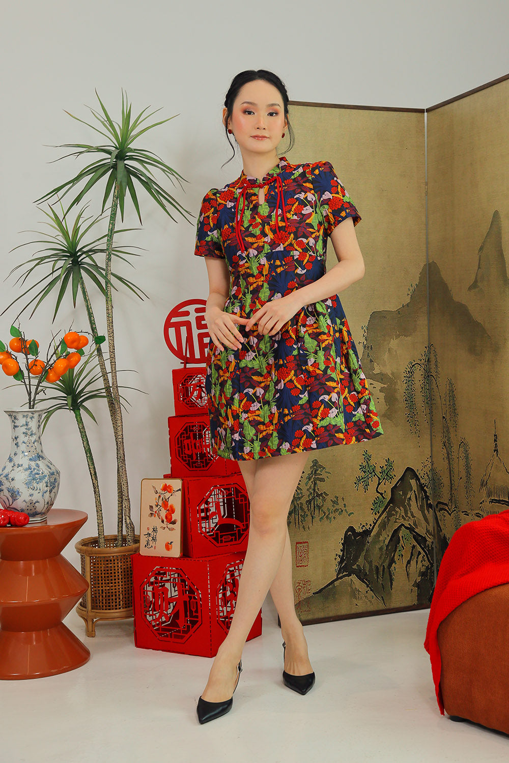 The Midnight Bloom colourway features vibrant florals woven against a deep navy base for a bold, elegant CNY statement, while Pastel Bloom offers a softer, romantic take perfect for daytime celebrations. Finished with short sleeves and a gently flared skirt, the dress creates a flattering, effortless fit suitable for festive gatherings and reunion dinners.