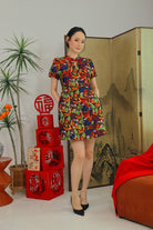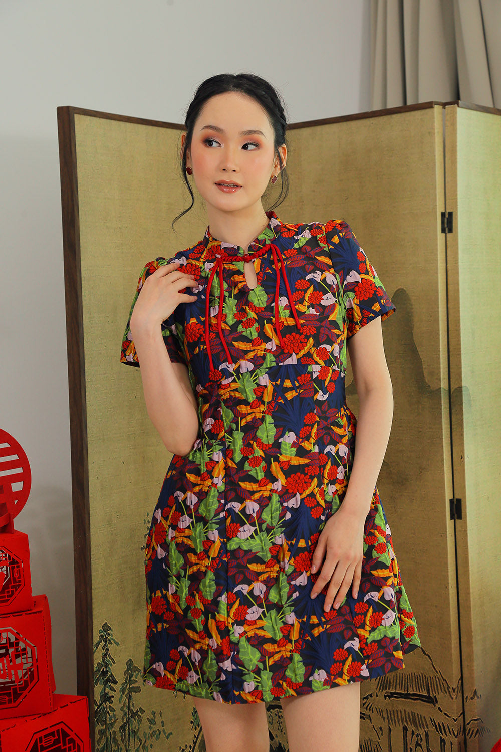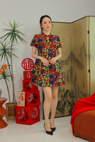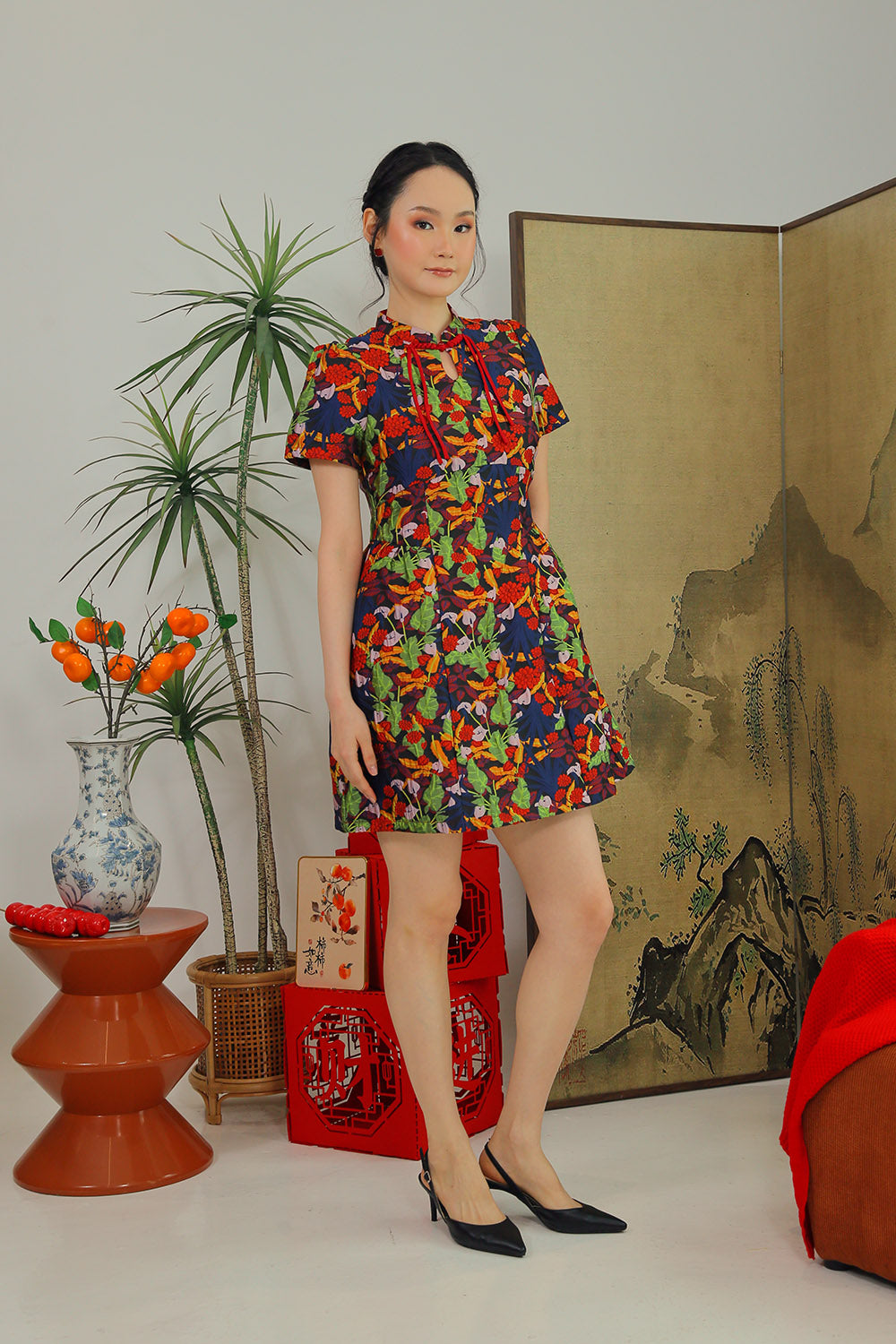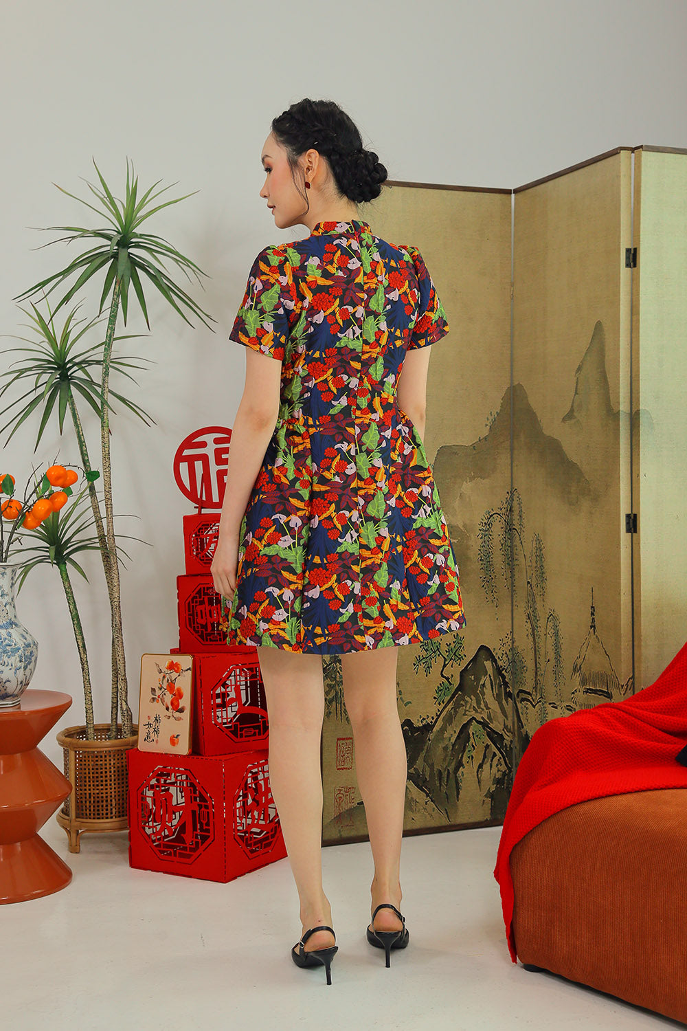 The Midnight Bloom colourway features vibrant florals woven against a deep navy base for a bold, elegant CNY statement, while Pastel Bloom offers a softer, romantic take perfect for daytime celebrations. Finished with short sleeves and a gently flared skirt, the dress creates a flattering, effortless fit suitable for festive gatherings and reunion dinners.