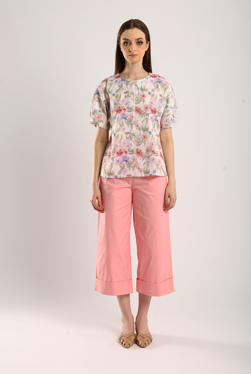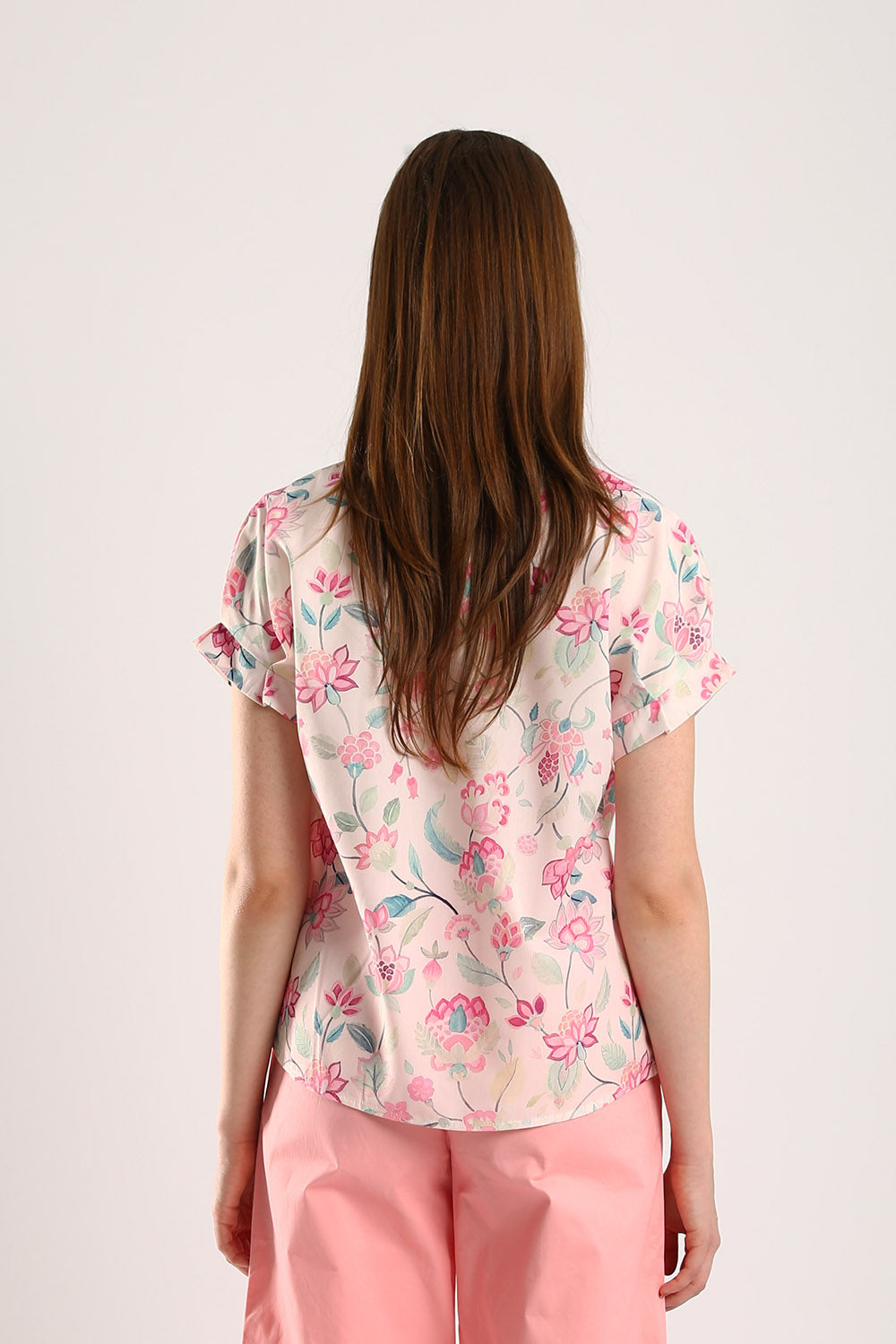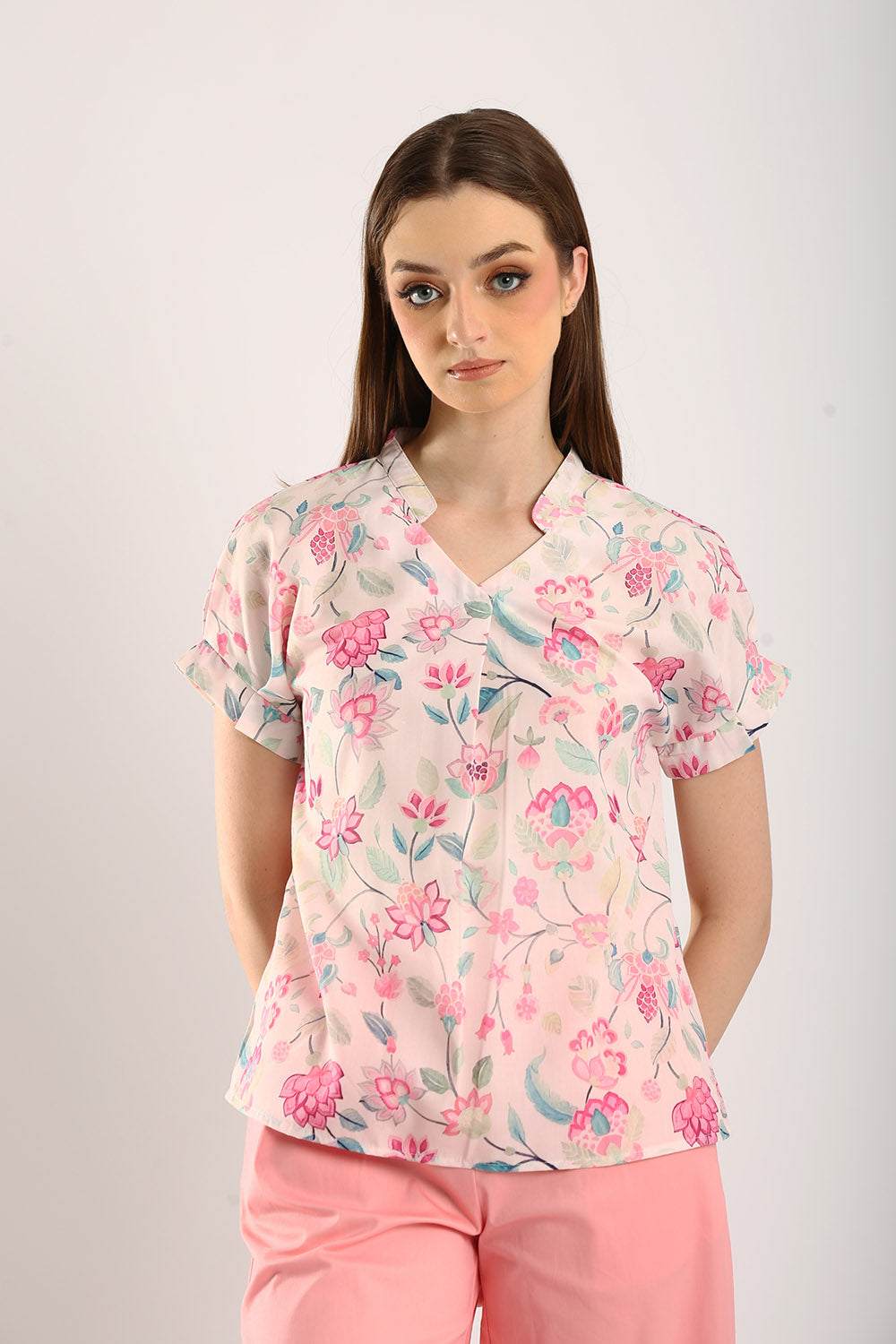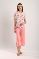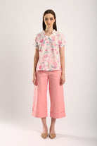 Elevate your everyday wardrobe with the Novi Cotton-Linen Blouse in Pink Floral. Crafted from a blend of lightweight cotton and linen, this blouse showcases a delicate floral print in soft pink hues, perfect for adding a touch of femininity to your outfit. Designed with a flattering V-neckline and charming rolled sleeves, it combines elegance with comfort. Pair it effortlessly with tailored pants, skirts, or shorts for versatile styling options that transition from casual to chic.