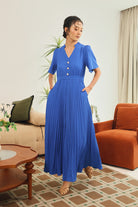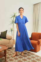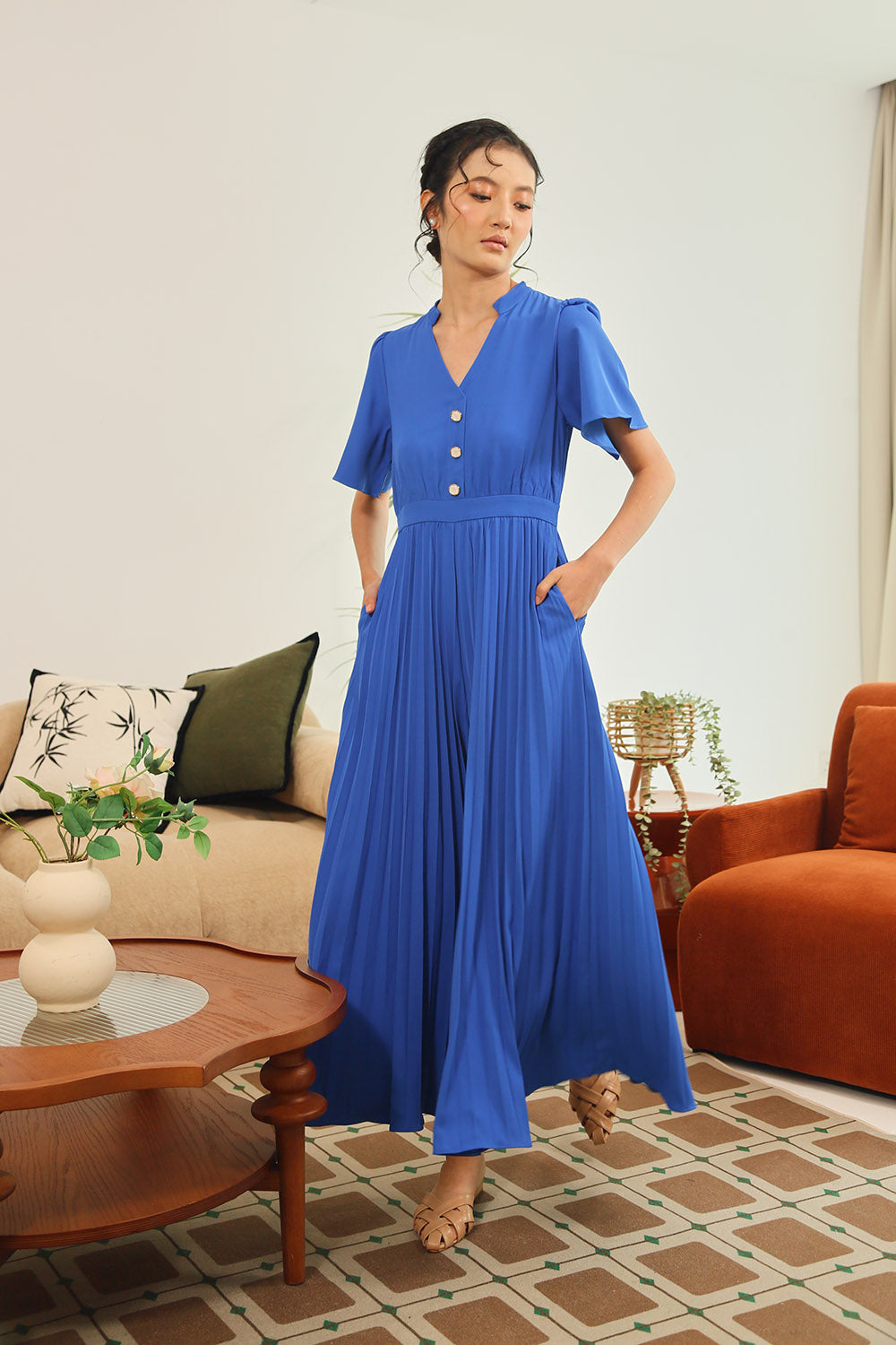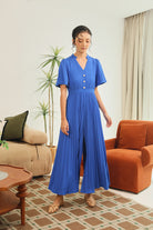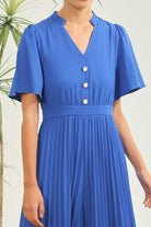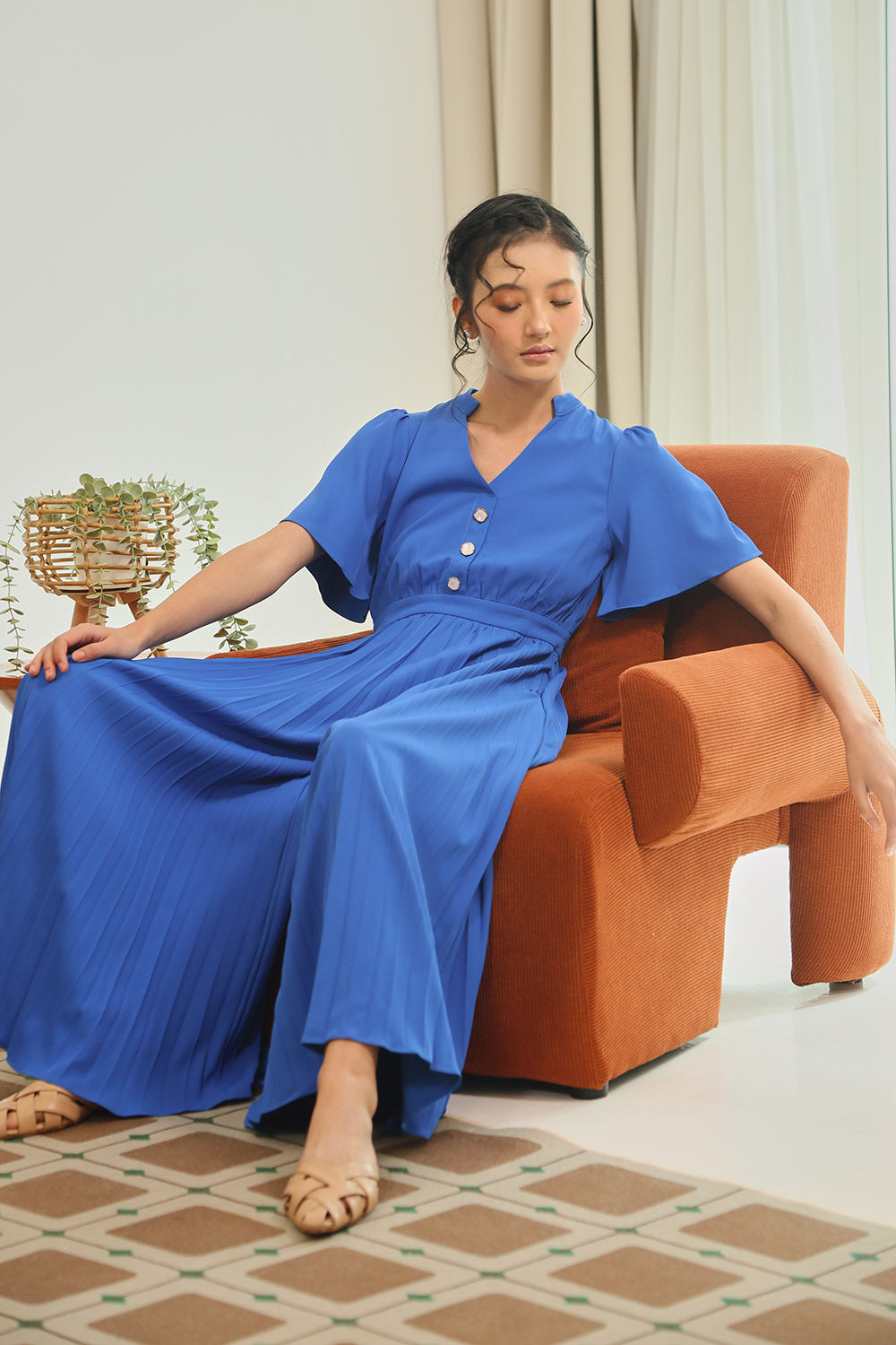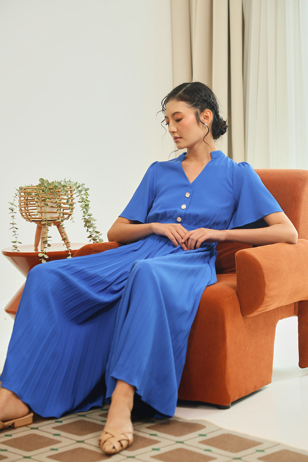 Step into timeless sophistication with the Kristela Jumpsuit, now in a striking blue hue. Designed with a flattering V-neckline, flutter sleeves, and front decorative buttons, it balances elegance with modern ease. The wide waistband cinches the silhouette, while pleated wide-leg bottoms flow beautifully with every movement.