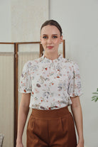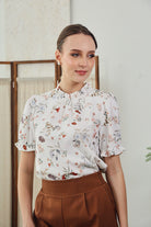 A refined floral piece with timeless charm. The Jonah Blouse showcases a soft white base adorned with green and earthy-toned florals, finished with a ruffled high neckline and puff sleeves with elasticated cuffs.