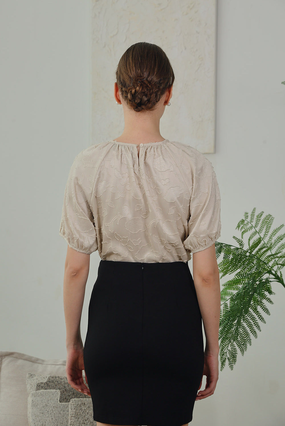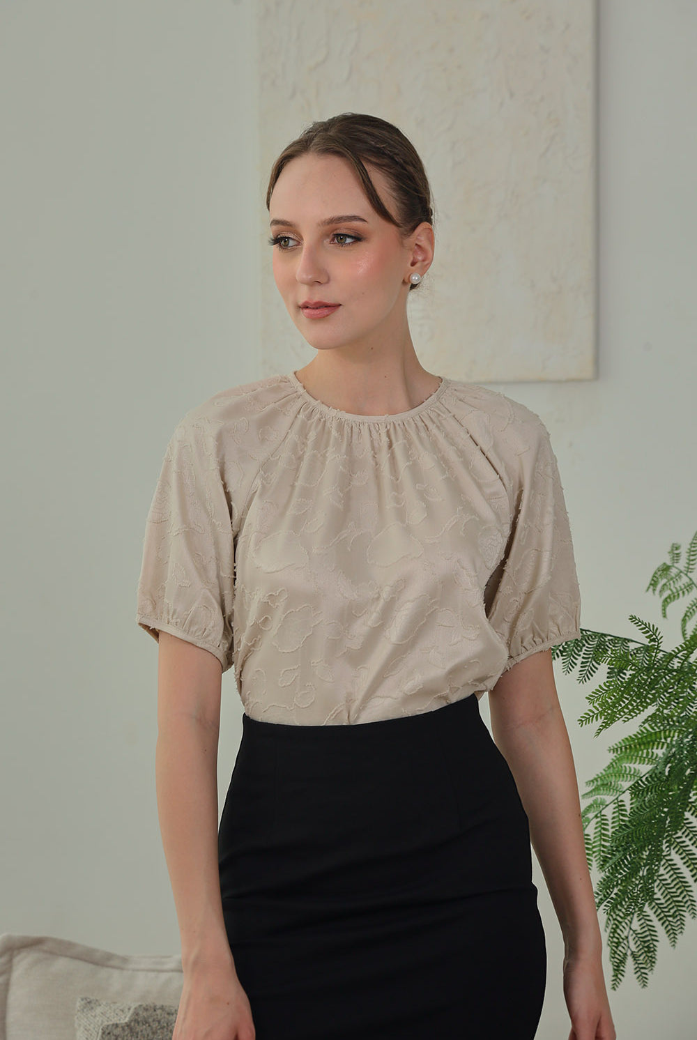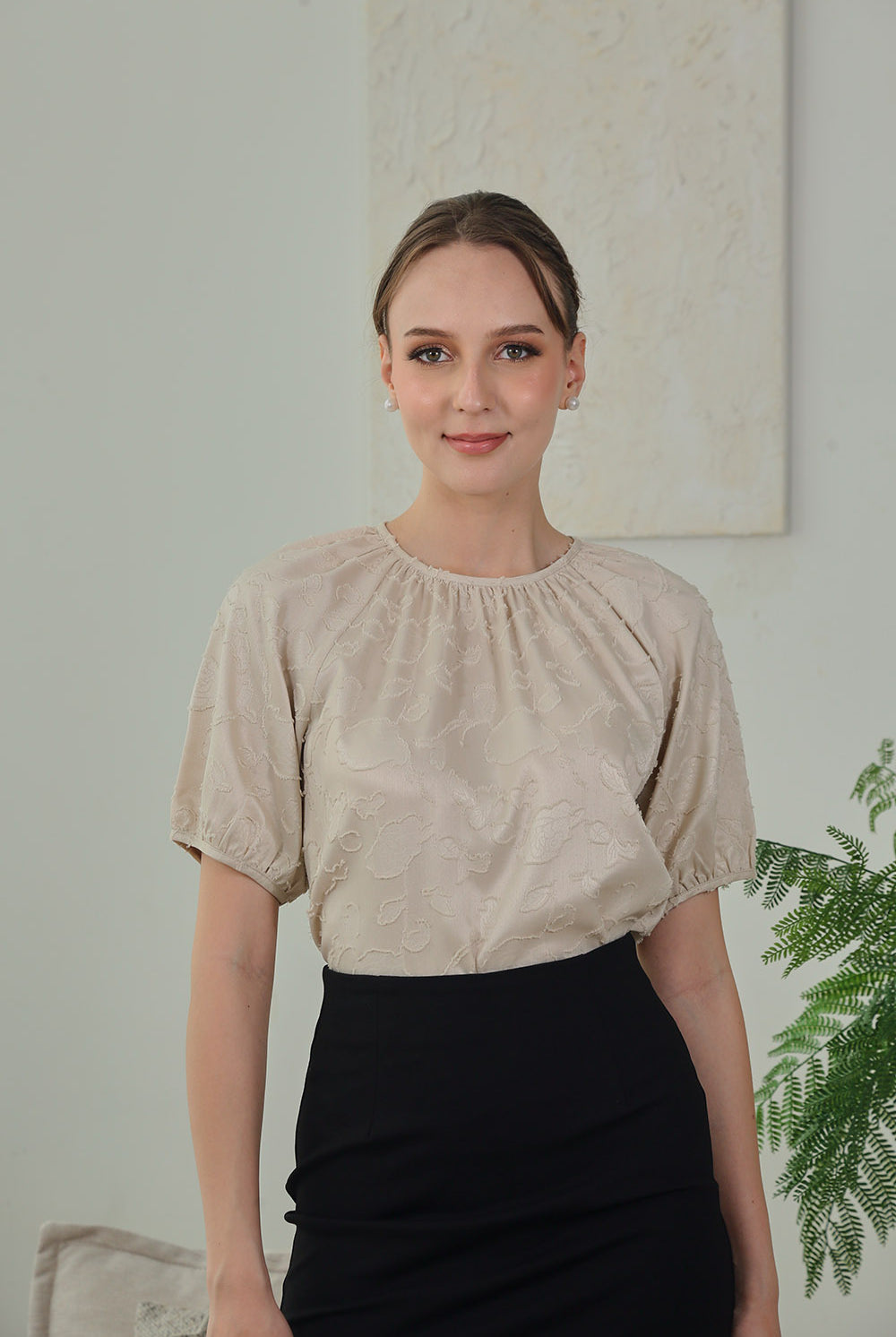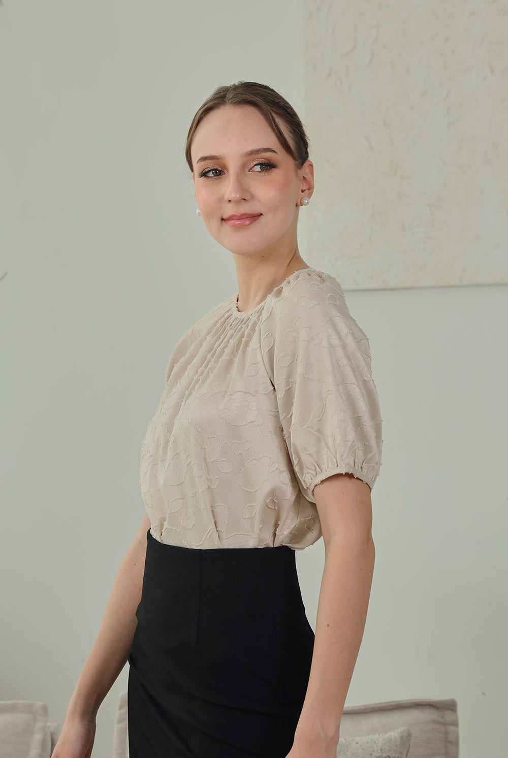 Timeless elegance with a modern twist. The Melina Top features softly gathered puff sleeves and a subtle floral jacquard texture that adds depth to its neutral hue. Finished with a round neckline and delicate back button closure, it’s a polished piece perfect for work or weekend.