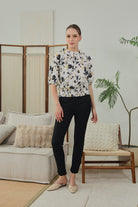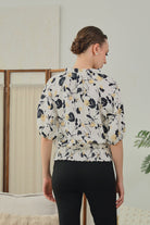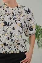 Brighten up your everyday with the Mili Blouse, featuring a hand-drawn floral print in soft mustard and black tones over a white base. Designed with a gathered round neckline and subtle keyhole detail, this blouse exudes effortless charm. The voluminous sleeves and smocked hem create a flattering silhouette that’s both polished and relaxed.