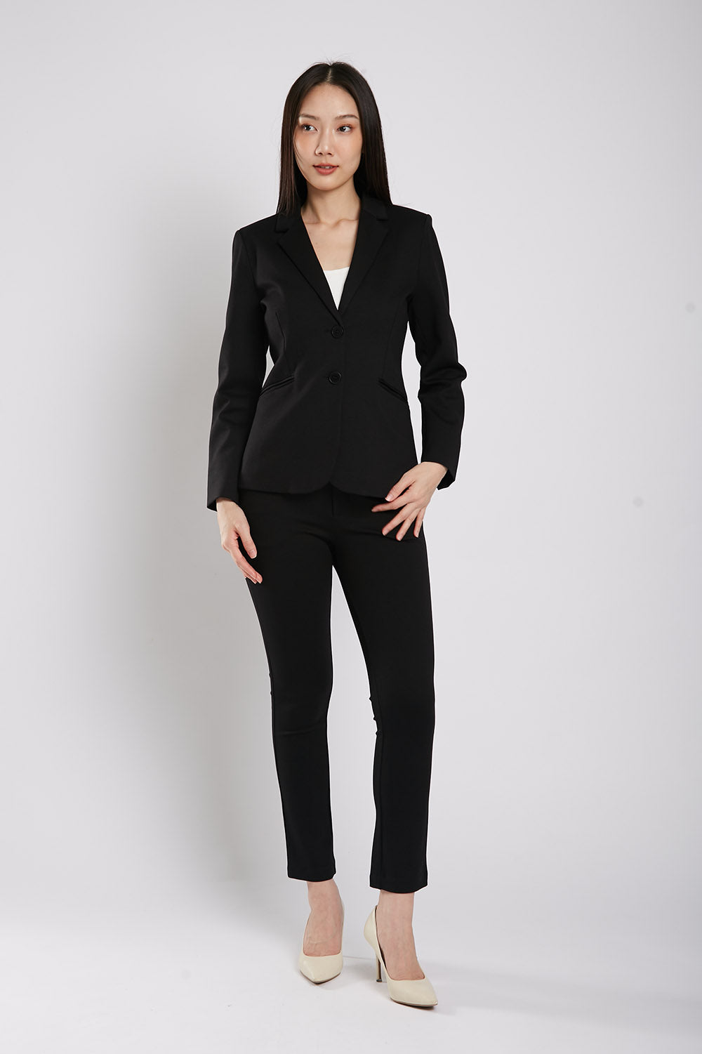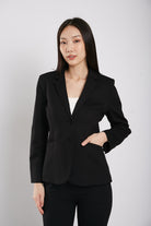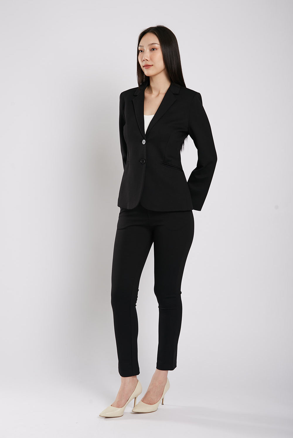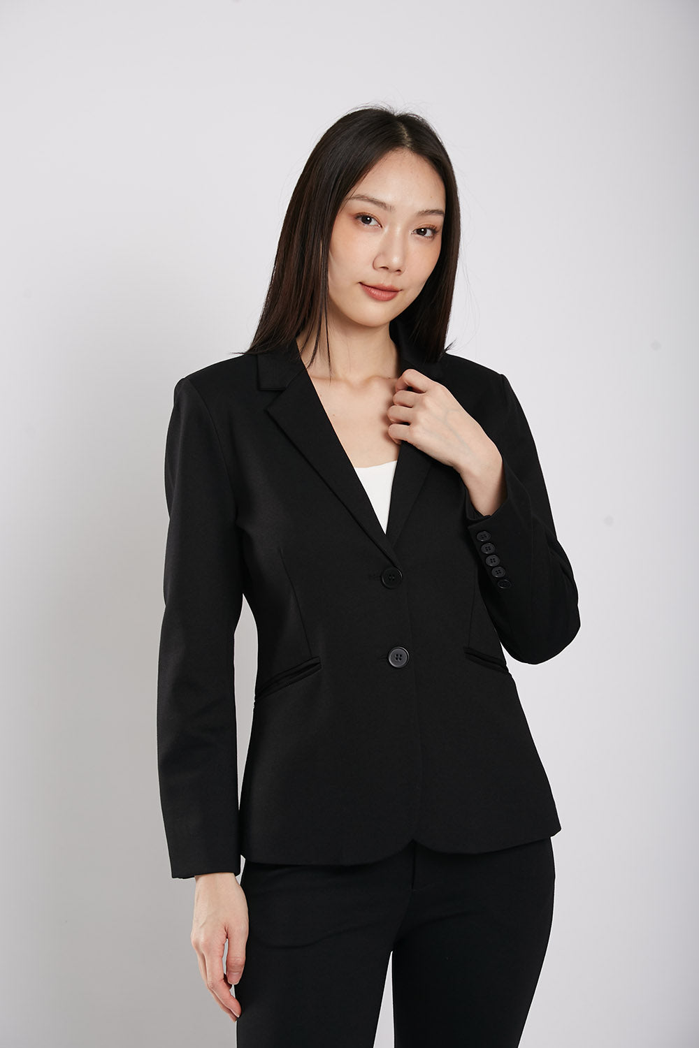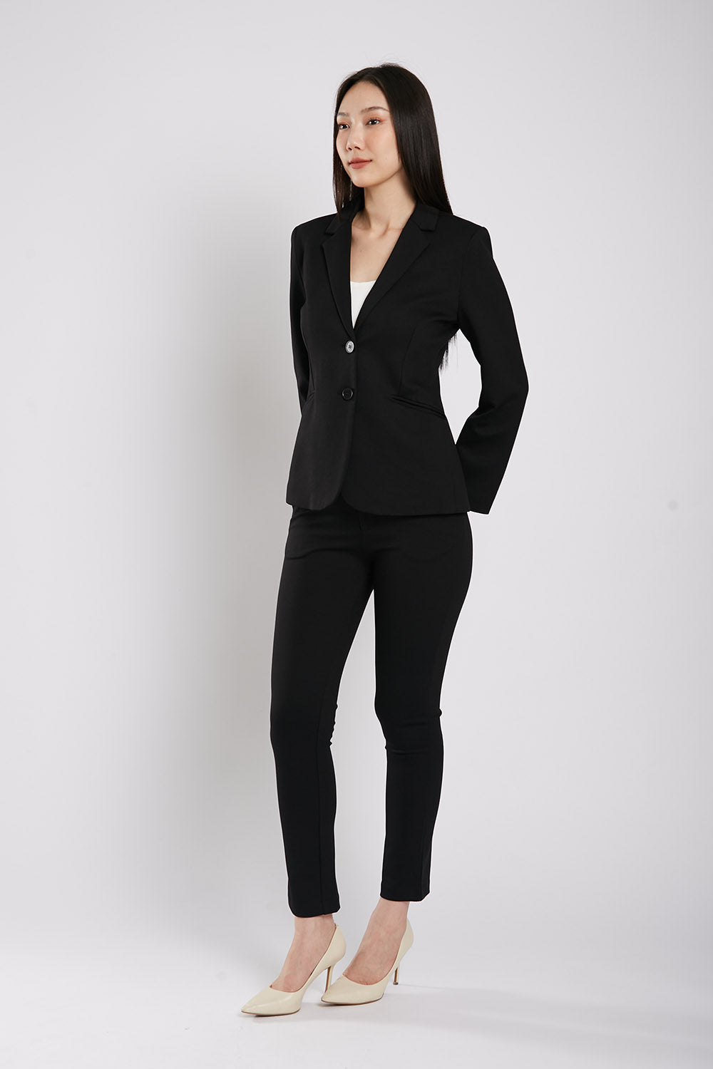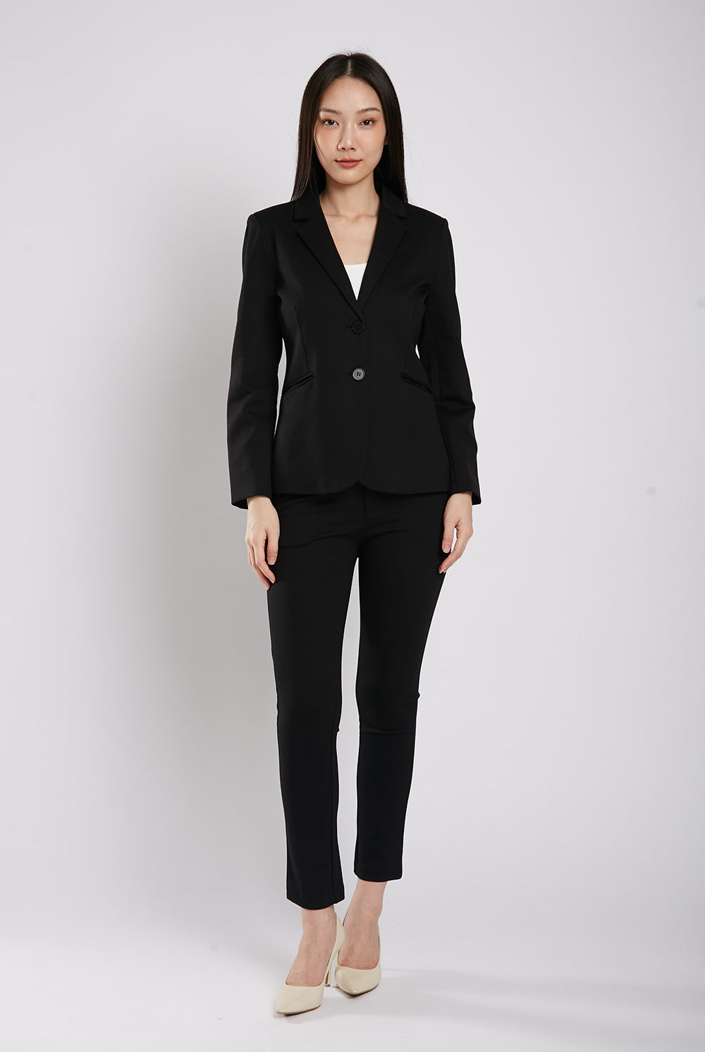 Introducing Albertha Ultra Stretchable Blazer in Black. Made with premium weight ultra stretchable fabric, this slim-cut blazer offers maximum comfort and style. Featuring front functional pockets and a two-button closure, it's the perfect addition to any professional wardrobe.