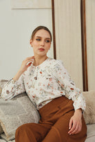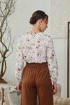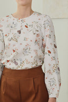 Feminine and refined, the Belize Blouse showcases a delicate floral print in warm earthy tones over a soft white base. Designed with a clean round neckline and elegant front button closure, this blouse is perfect for elevating your everyday look.