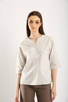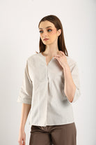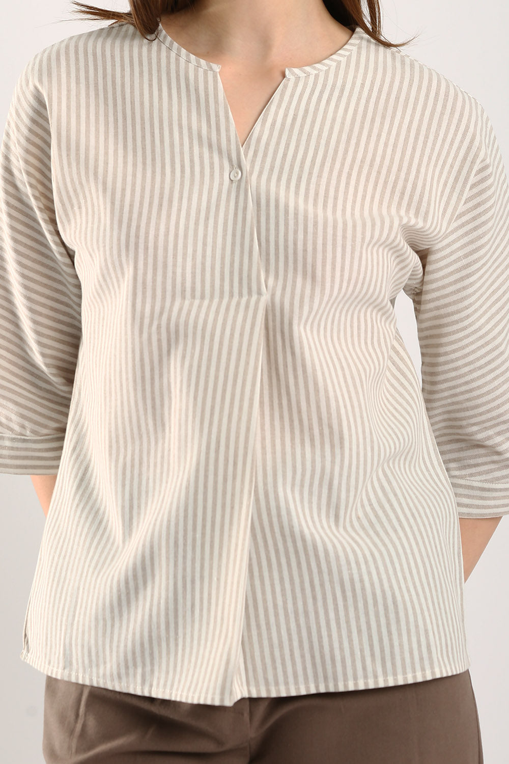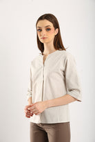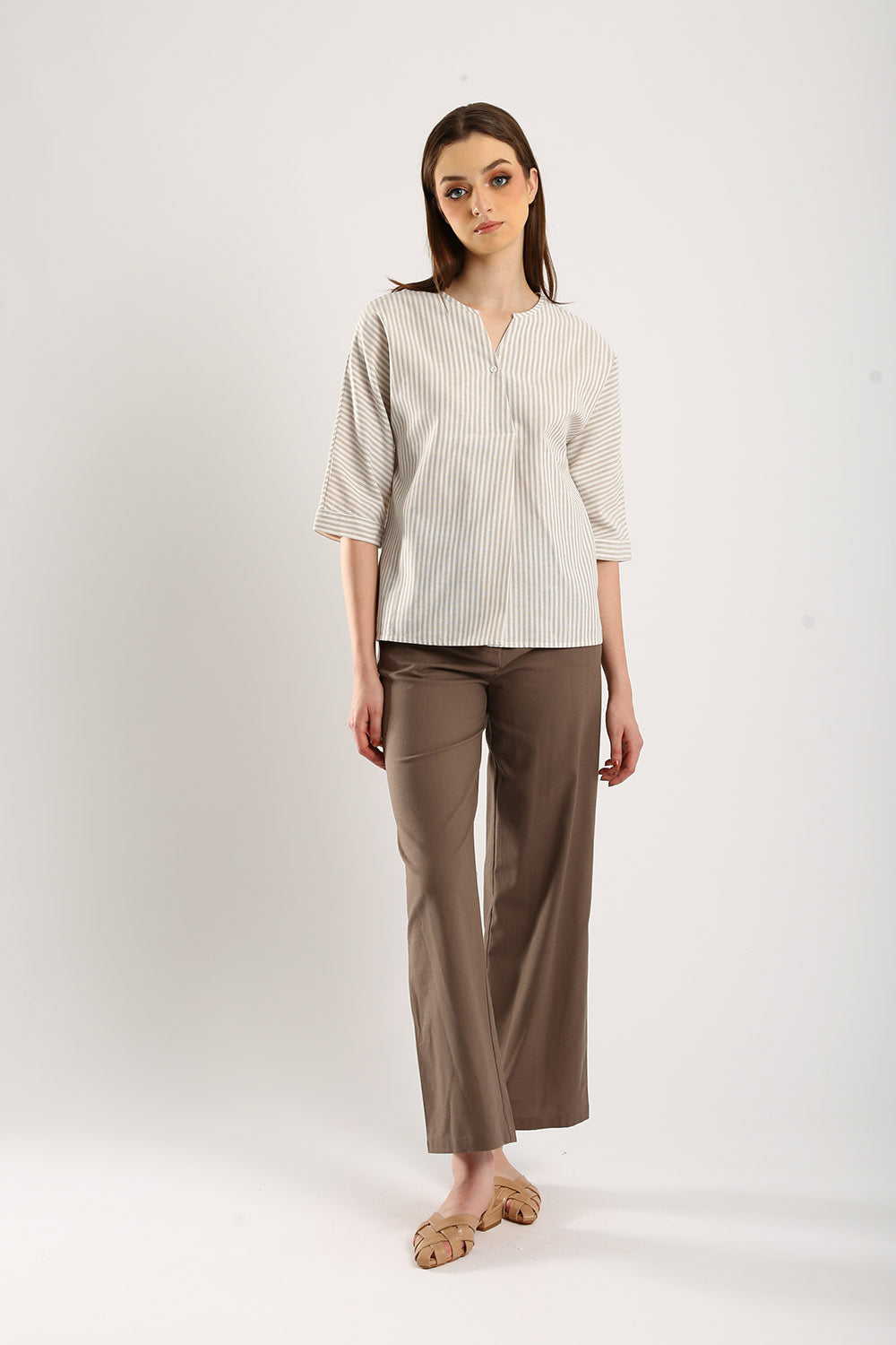 Effortlessly chic, this striped linen top combines comfort with a refined, minimalist design. Crafted from a lightweight linen blend, it offers a relaxed fit with elbow-length sleeves for a breezy feel. The subtle stripe pattern adds a classic touch, while the split neckline with a single button closure enhances its laid-back elegance. Perfect for pairing with both casual and tailored bottoms, this versatile top is ideal for everyday wear. Embrace a timeless style with this essential piece that captures the Simple Spirit ethos of premium craftsmanship and comfort.