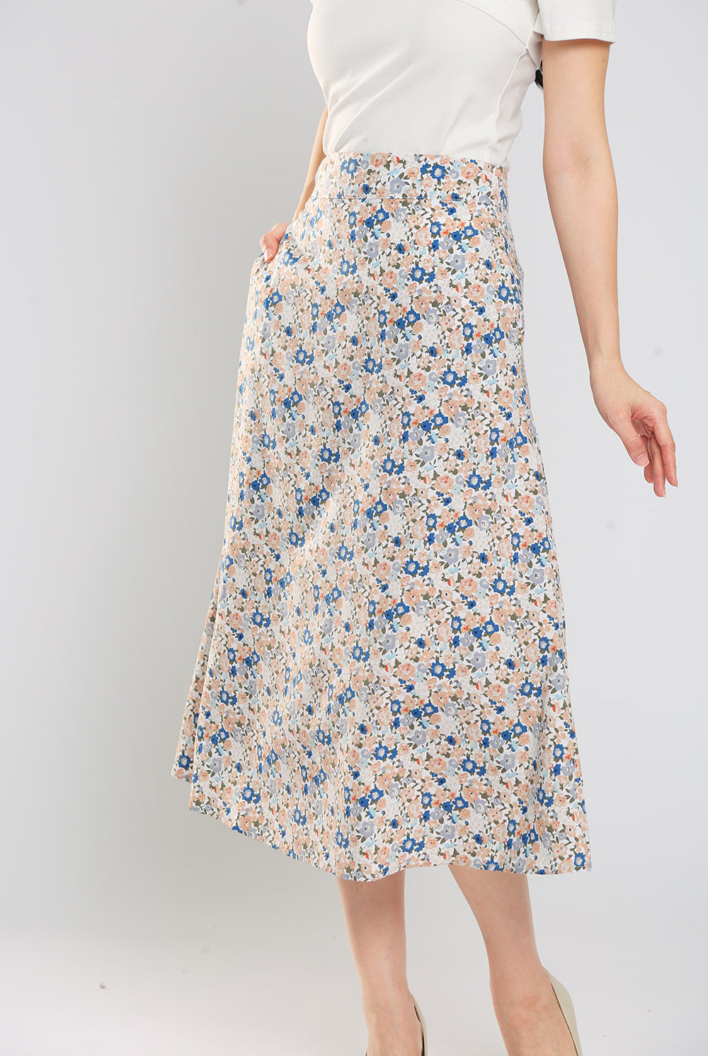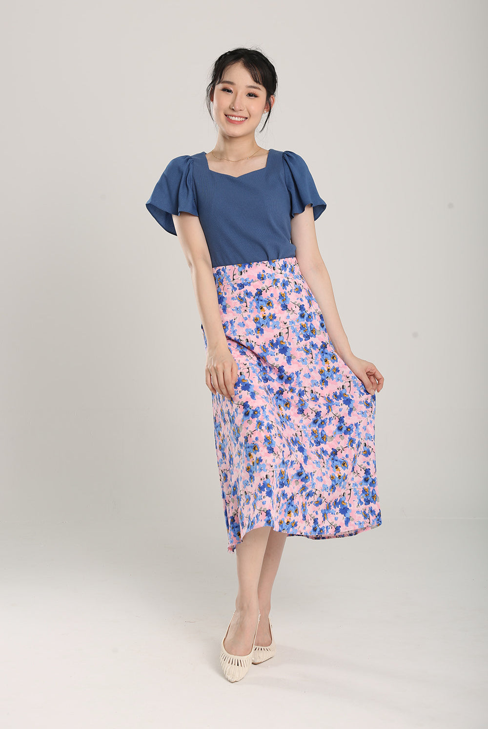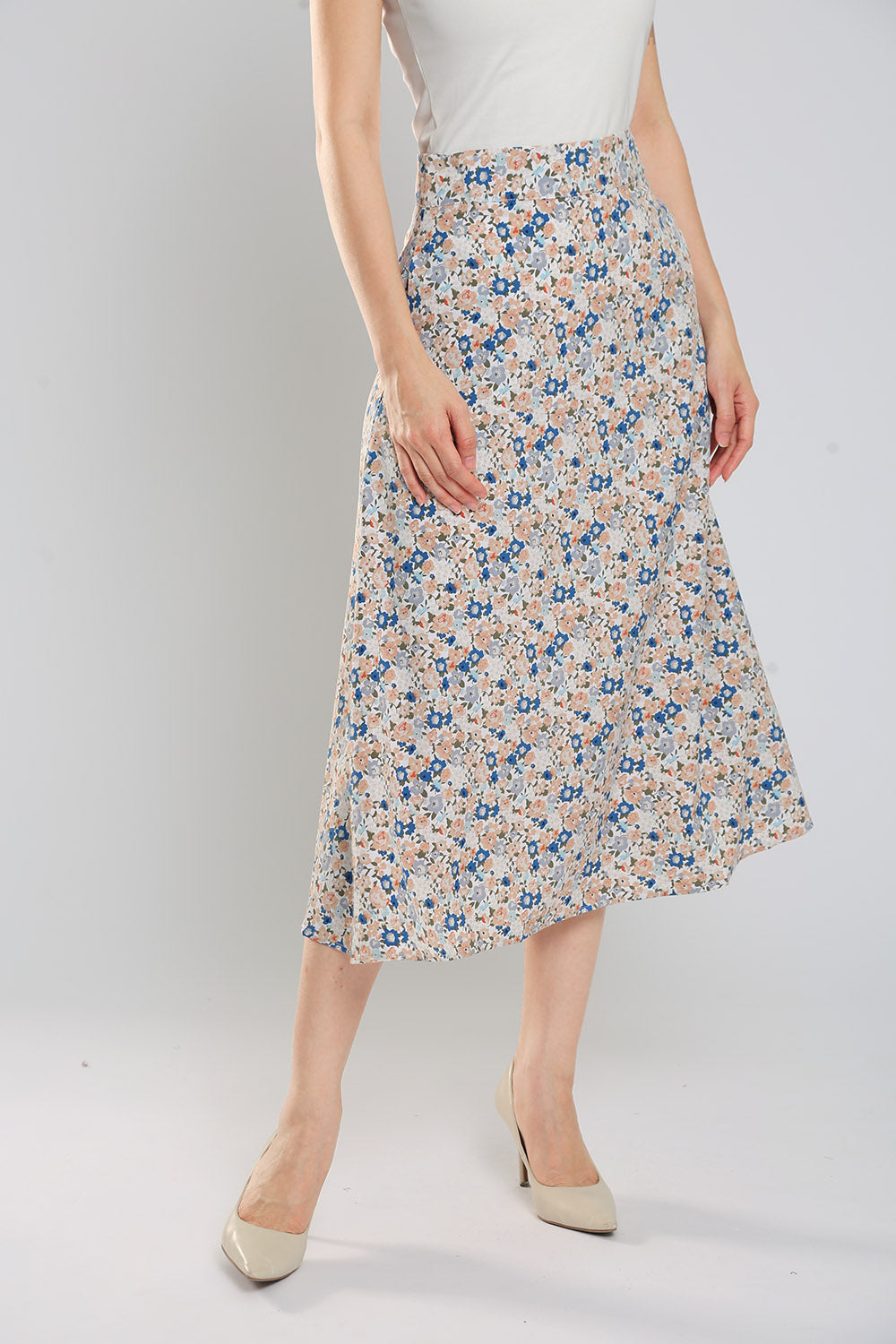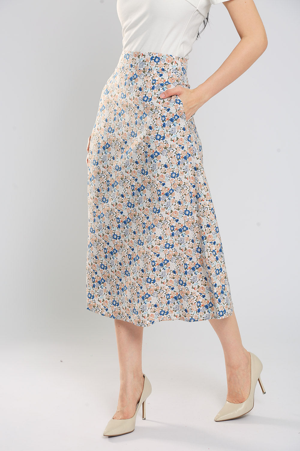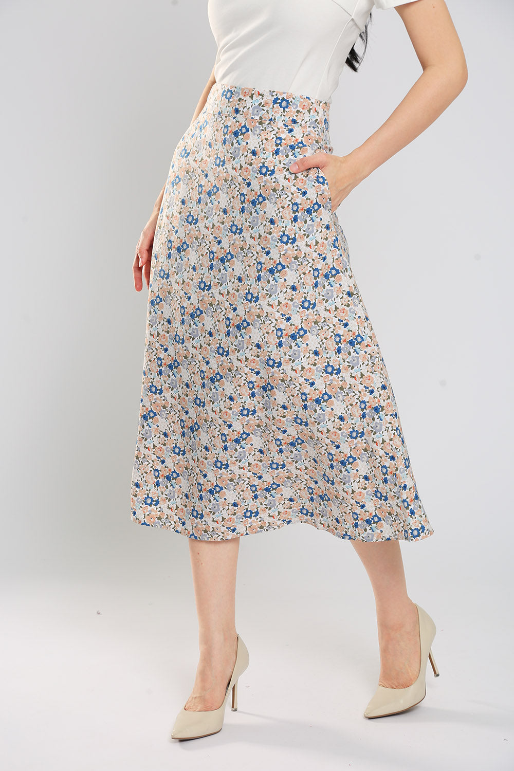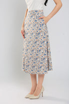 Delania Floral Print Midi Skirt in Apricot Blue Floral