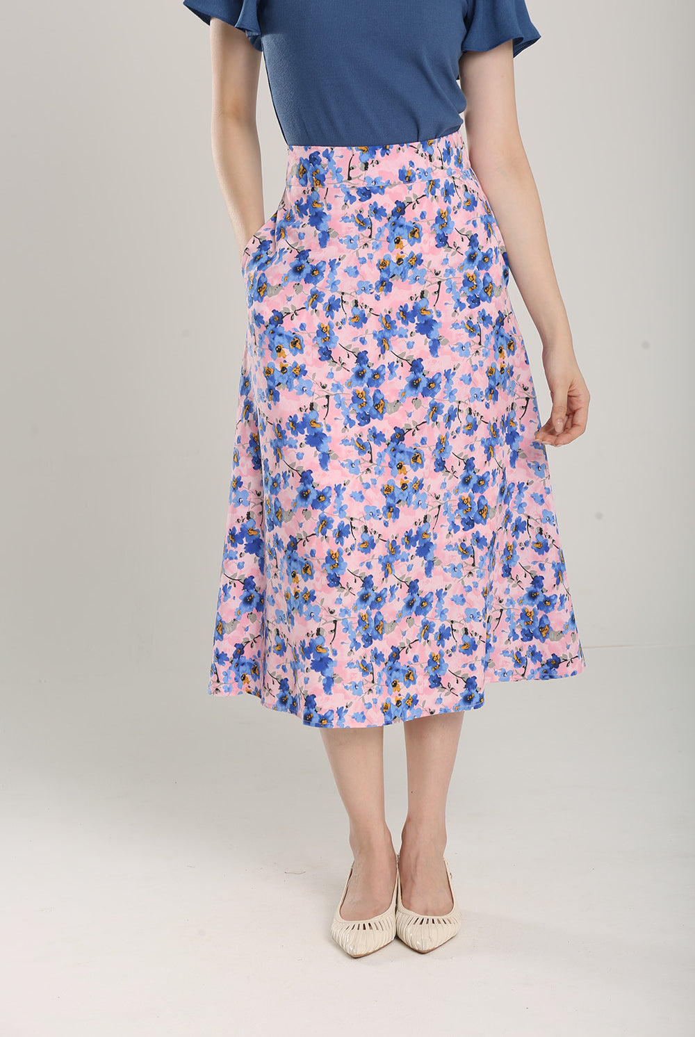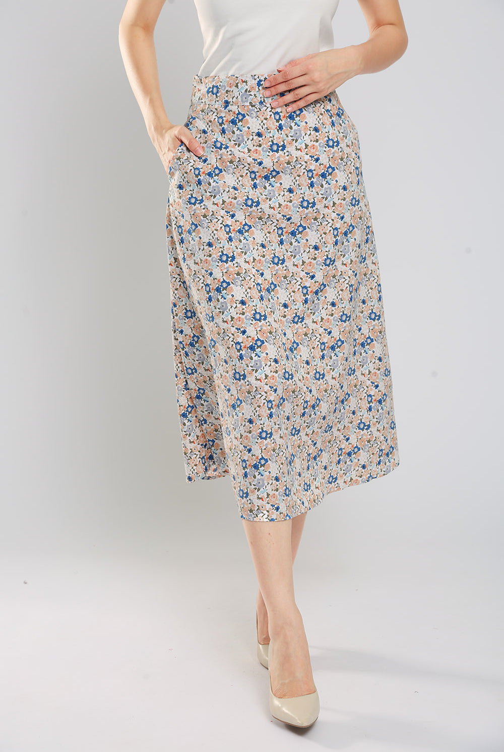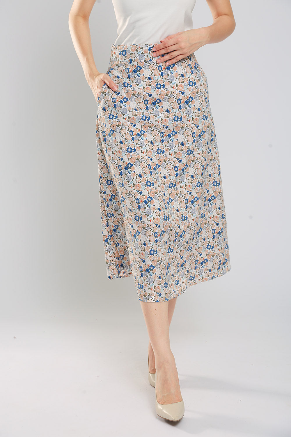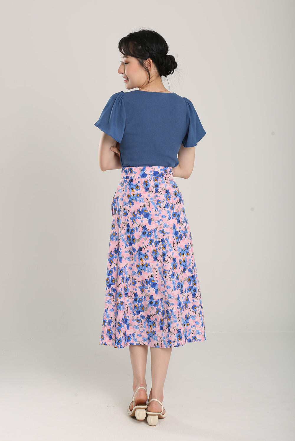 Delania Floral Print Midi Skirt in Apricot Blue Floral