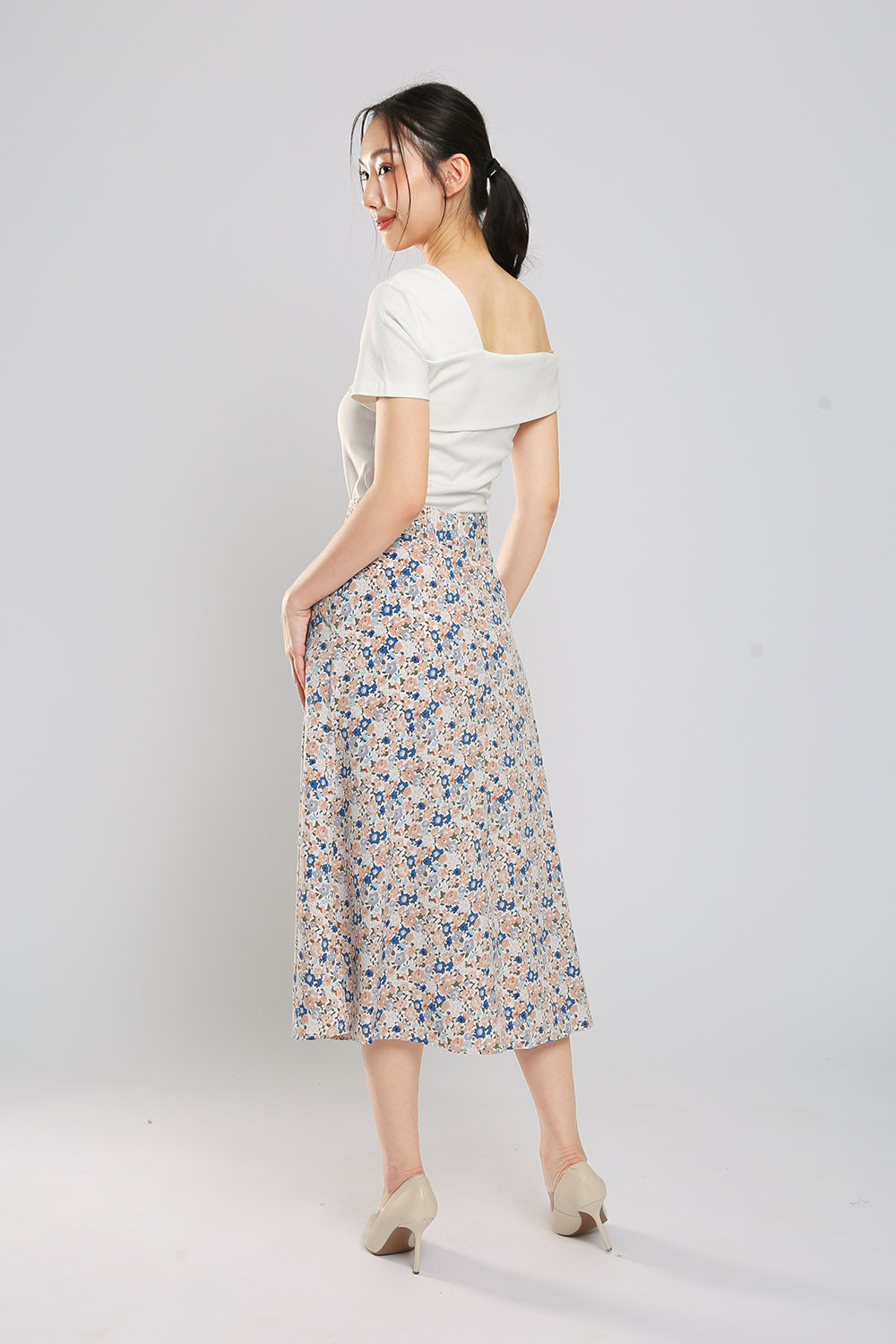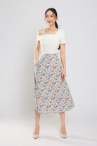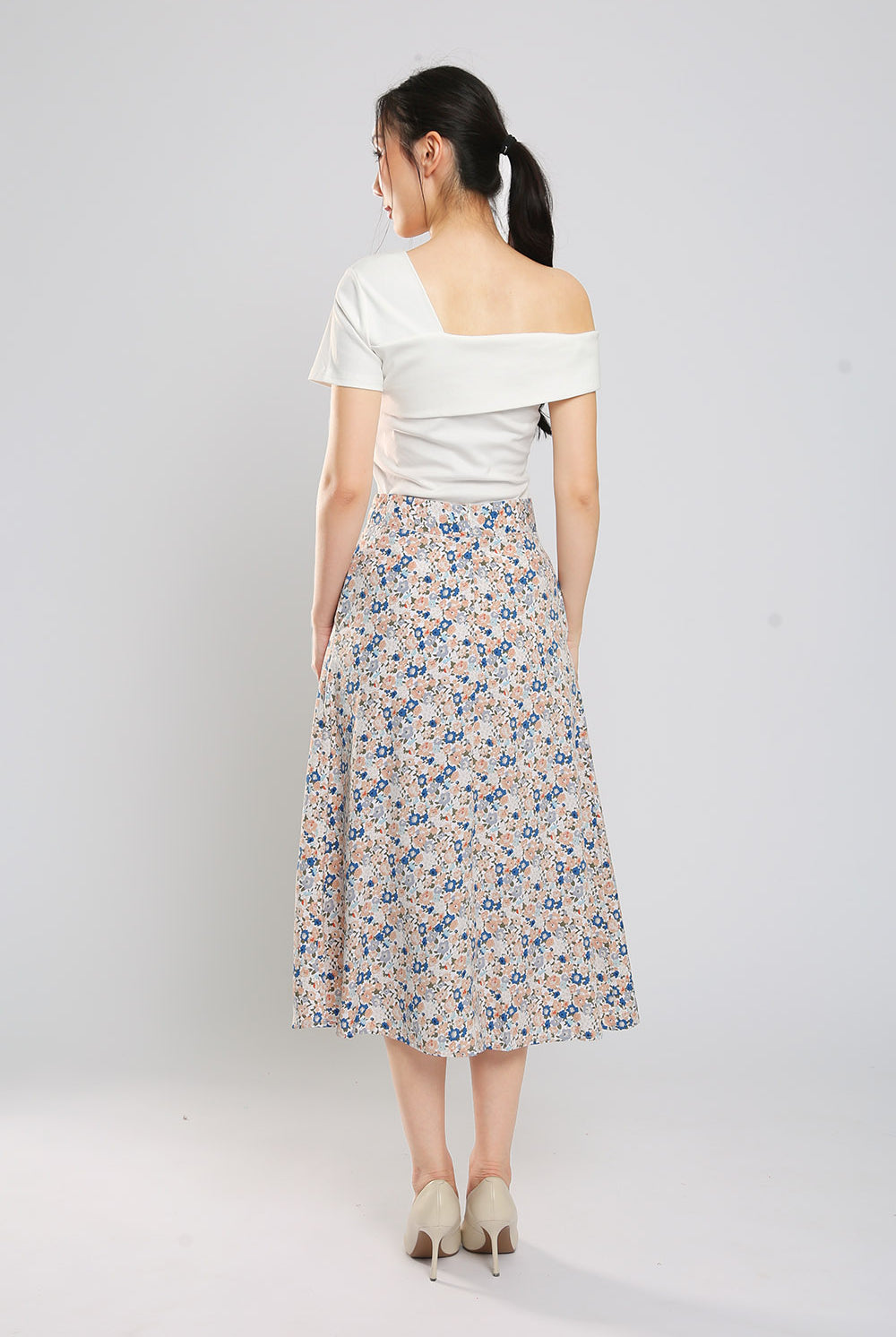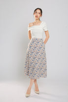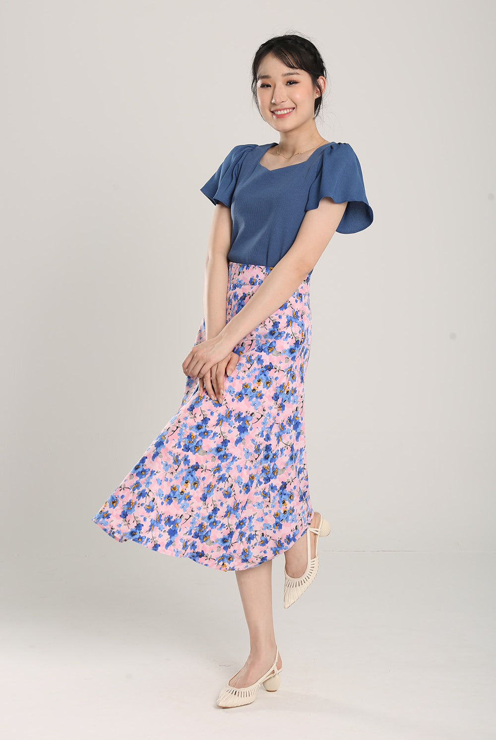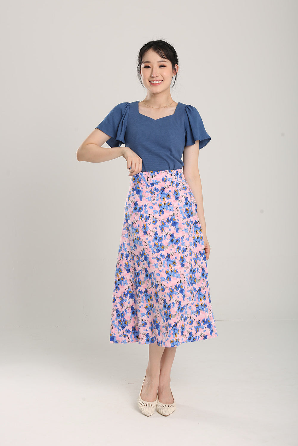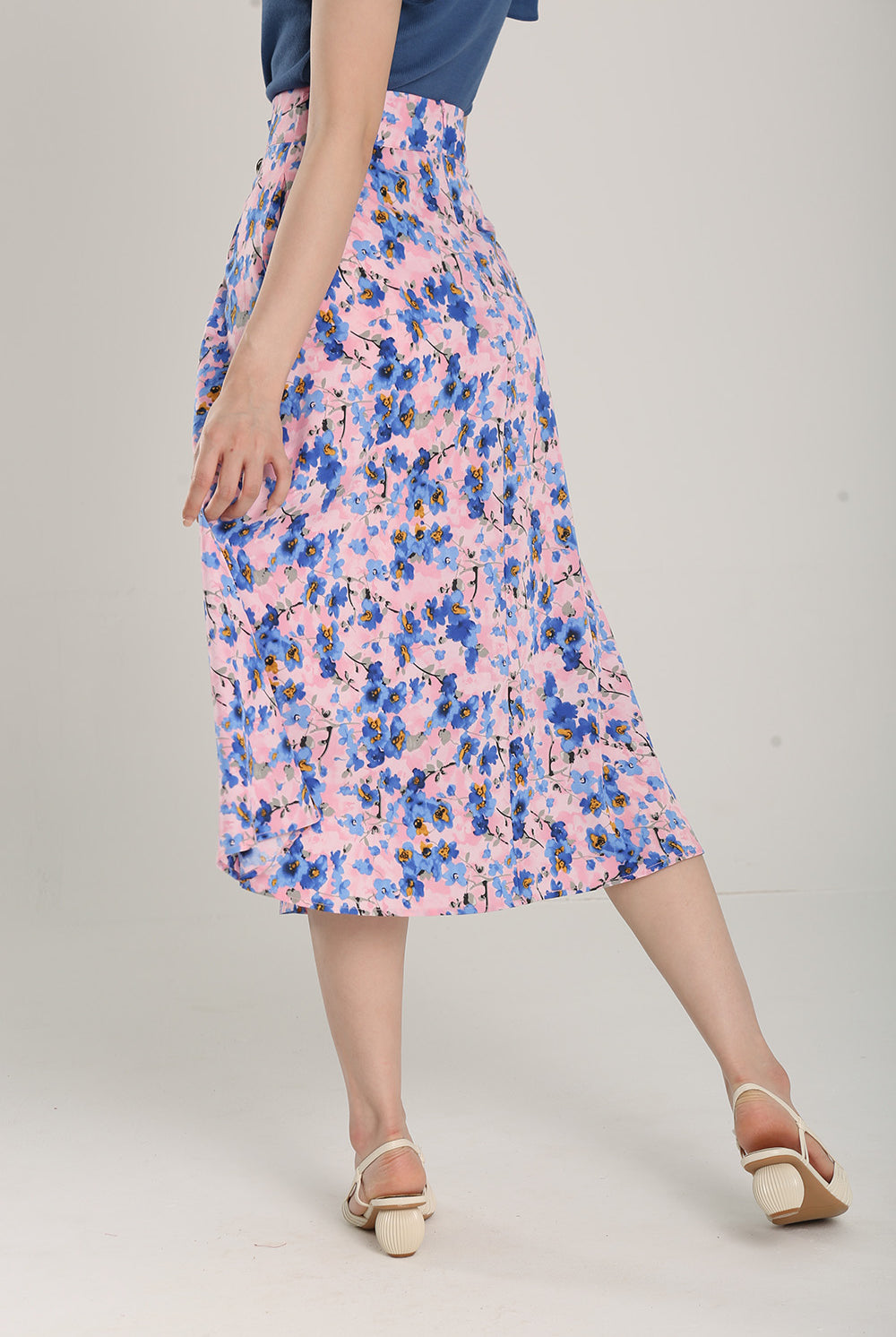 Delania Floral Print Midi Skirt in Apricot Blue Floral