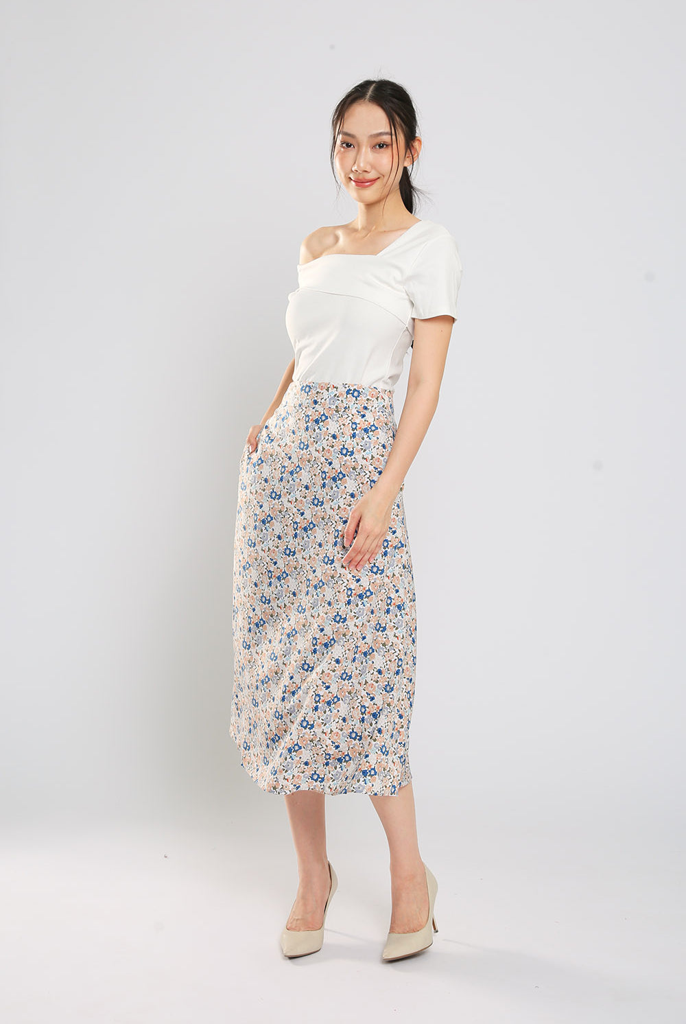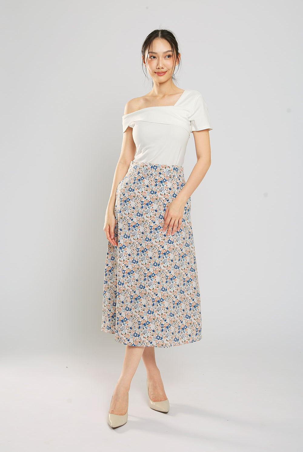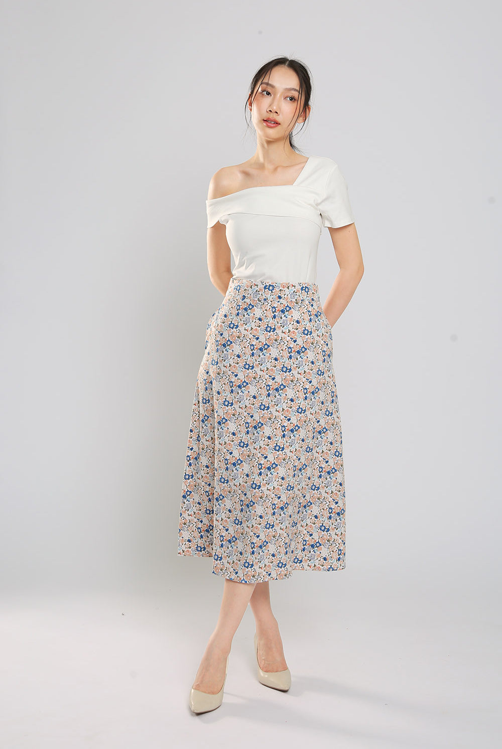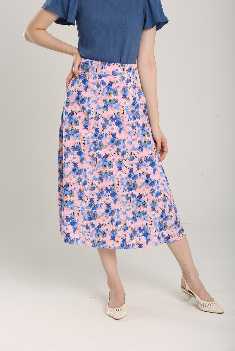 Delania Floral Print Midi Skirt in Apricot Blue Floral