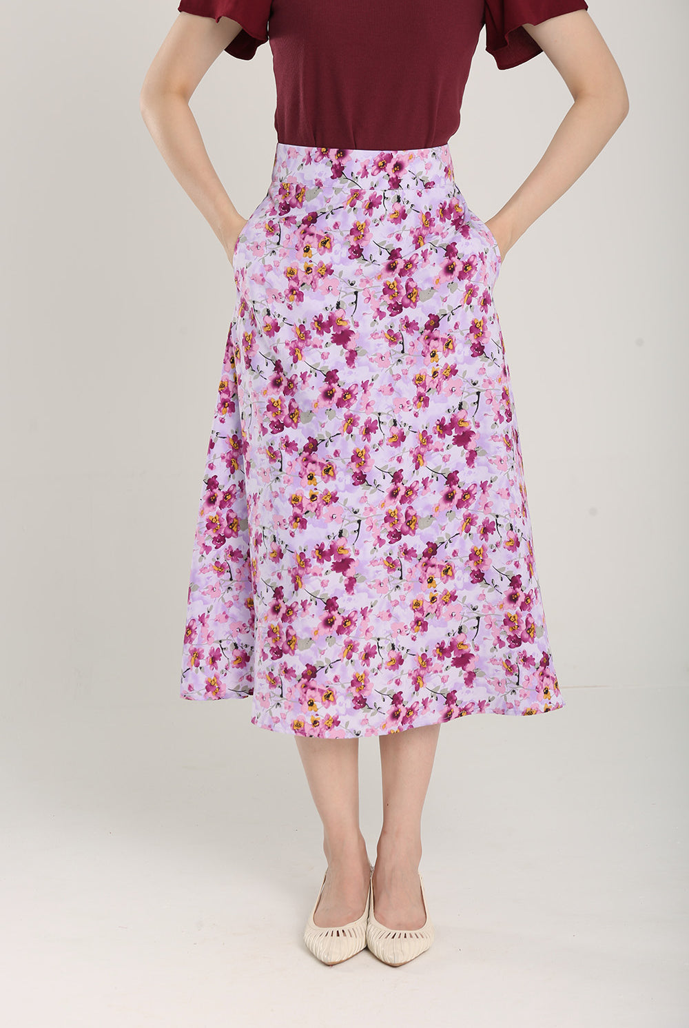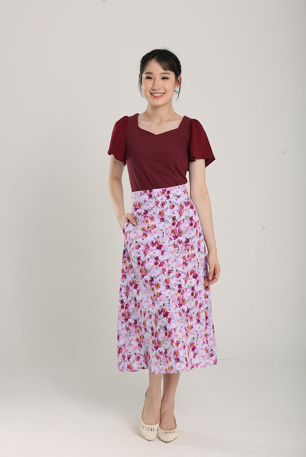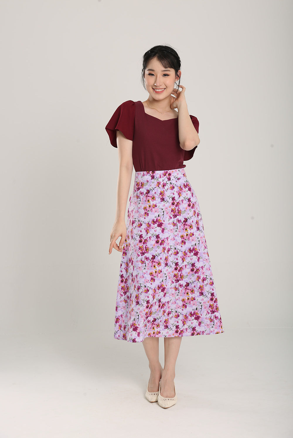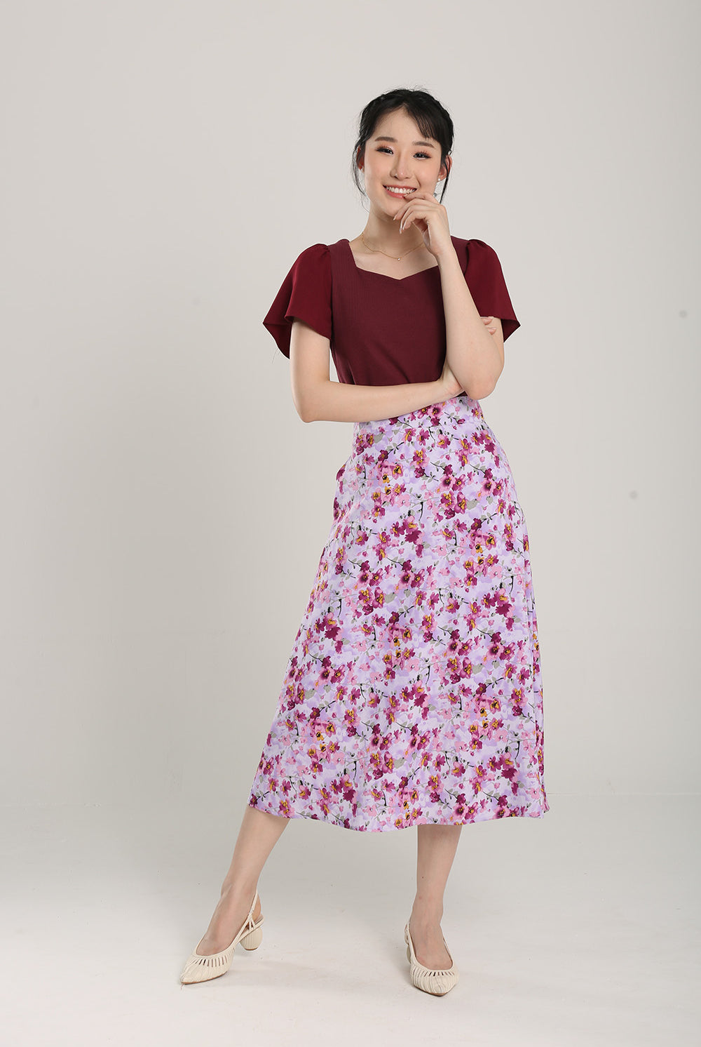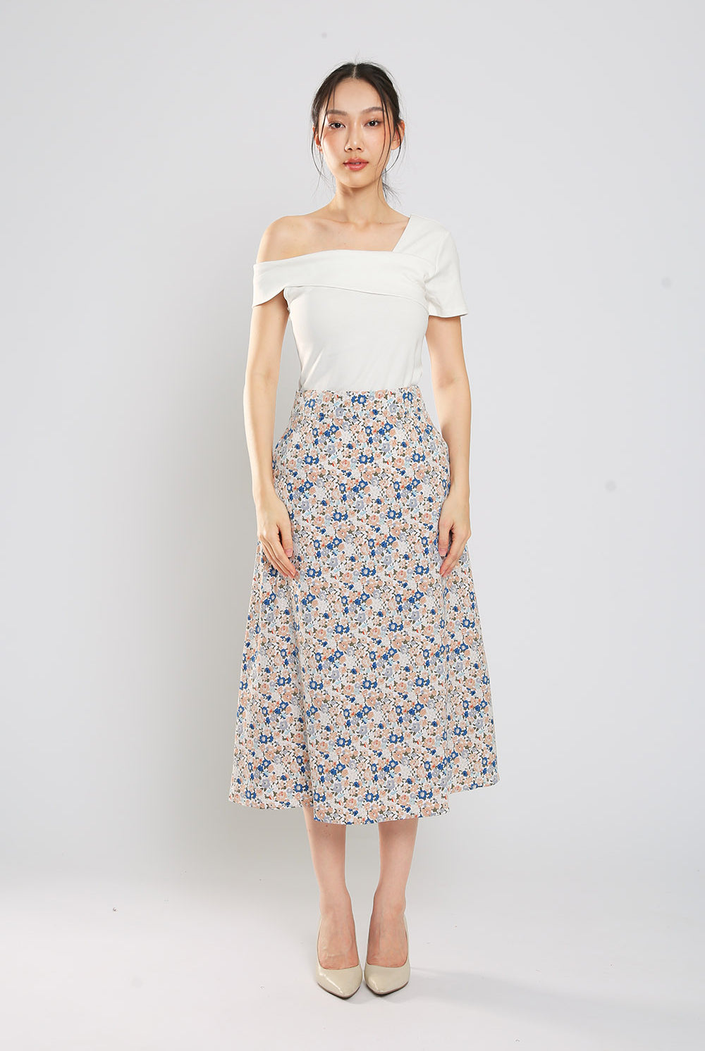 Delania Floral Print Midi Skirt in Apricot Blue Floral