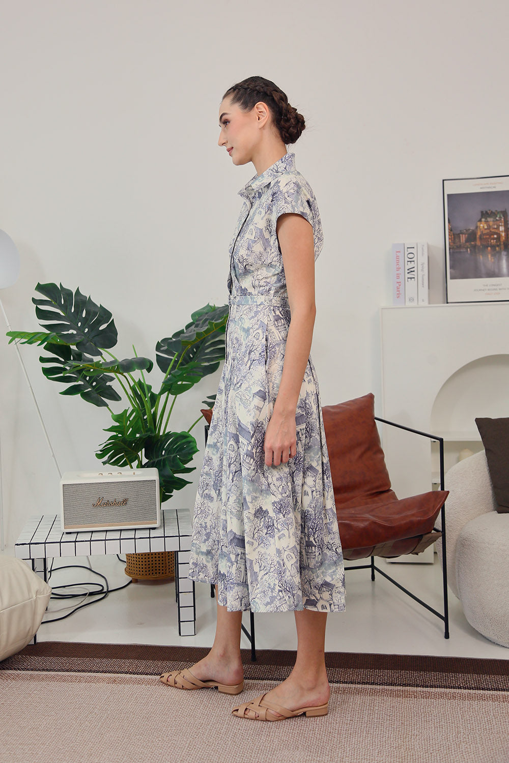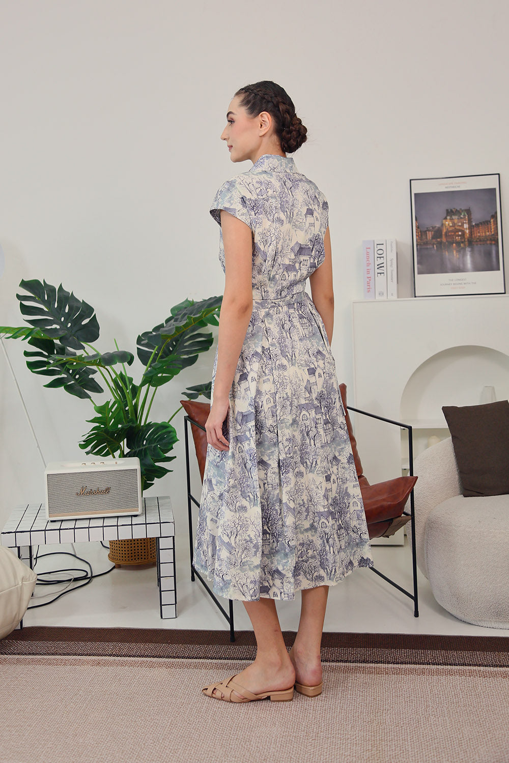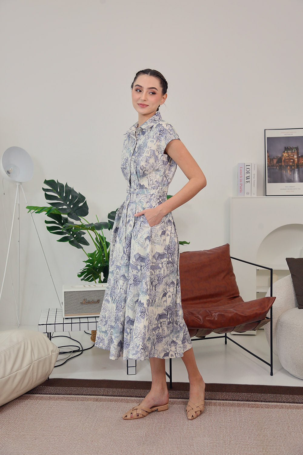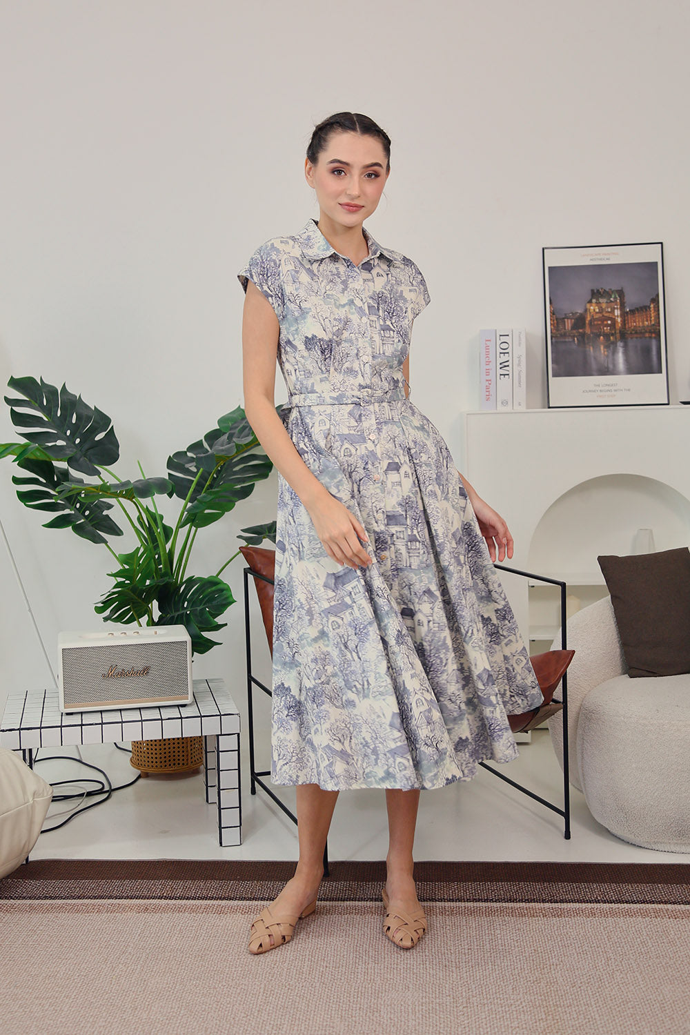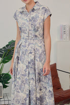 The scenic toile-inspired print evokes quiet countryside dreams, making this the perfect piece for leisurely days, café brunches, or a refined workday look. Complete with functional buttons and a modest front slit for ease of movement.