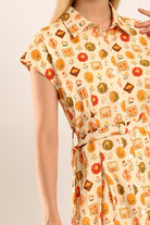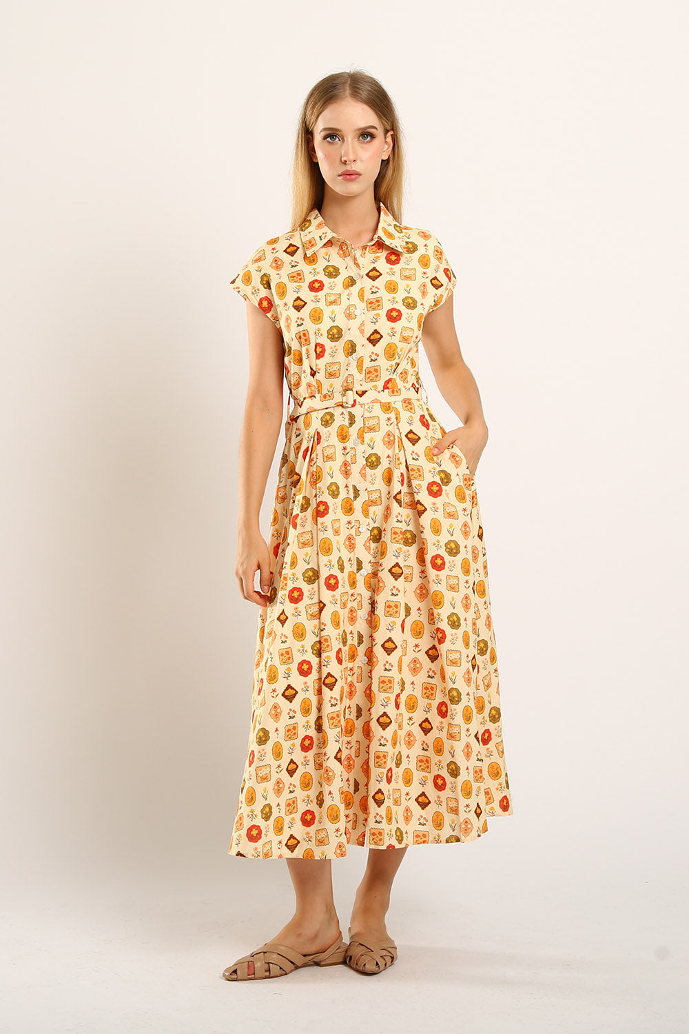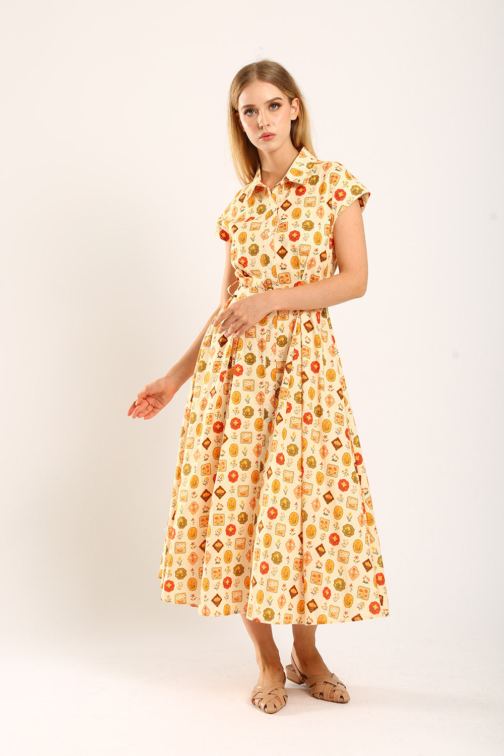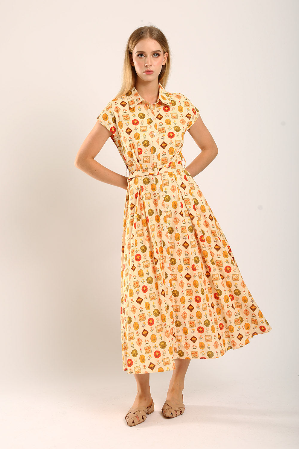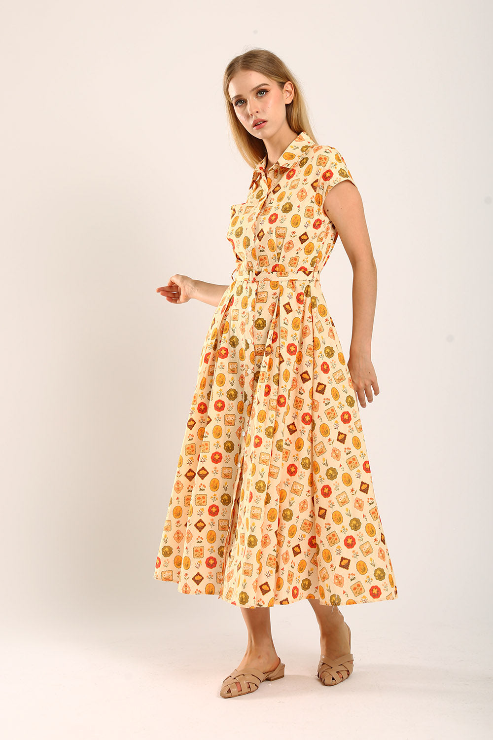 The dress is designed with cap sleeves, a classic collared neckline, and a button-down front for versatile styling. The cinched waist, accentuated with a matching fabric belt, beautifully flatters the silhouette, while the full midi skirt adds a touch of grace.