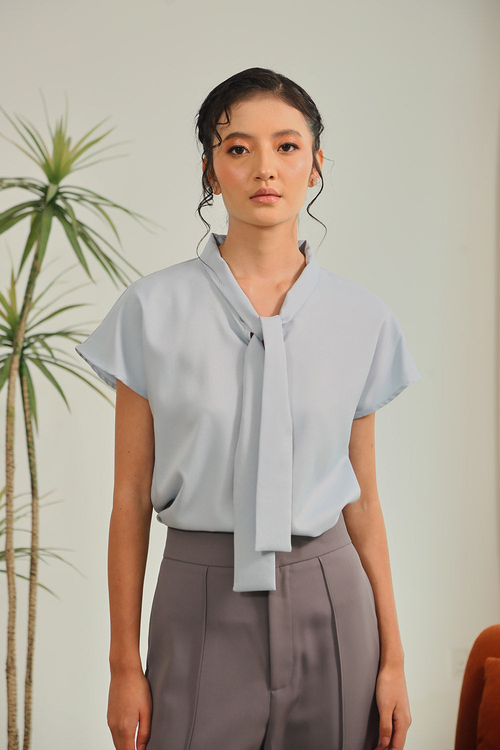 Softly feminine yet modern, the Graciela Blouse in Powder Blue brings a refreshing touch to everyday dressing. Made from premium lightweight fabric, it features a detachable sash that can be styled as a tie for a polished look or removed for a clean, minimalist finish. With its relaxed short sleeves and refined collar, this blouse is perfect for versatile styling from workdays to weekends.