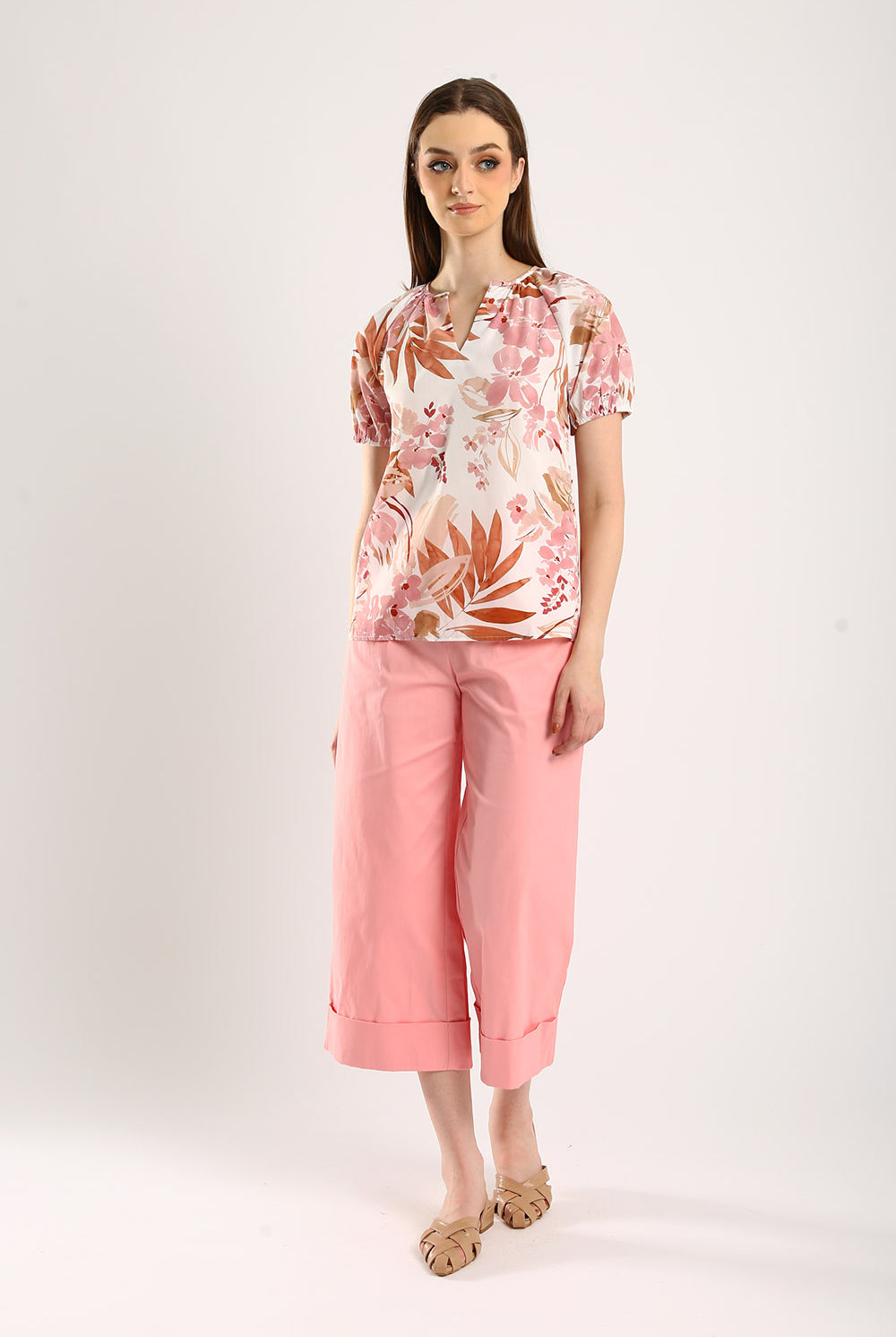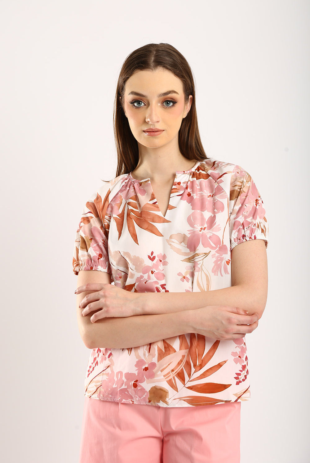 Bring a touch of nature’s beauty to your wardrobe with the Blossom Breeze Floral Cotton-Blend Top. This delightful top showcases a charming floral print in warm, earthy tones, perfect for adding a hint of elegance to any ensemble. Made from a soft, breathable cotton-blend fabric, it offers comfort for all-day wear. Featuring a relaxed fit, gathered short sleeves, and a subtle V-notch neckline, this top effortlessly combines style and ease. Pair it with your favorite jeans or trousers for a look that's both fresh and sophisticated, ideal for casual days or special outings.