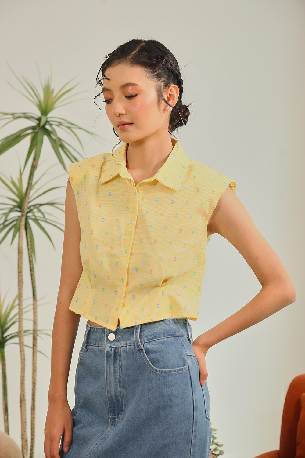 Bring playful charm to your everyday look with the Amina Sleeveless Shirt, available in cheerful Blue Gingham Pop and Yellow Gingham Pop. Crafted from lightweight gingham fabric, it features a relaxed boxy cut, classic shirt collar, and concealed button placket for a clean finish. The subtle multicolored embroidered dots add a touch of whimsy, making this piece perfect for both weekday styling and weekend ease.