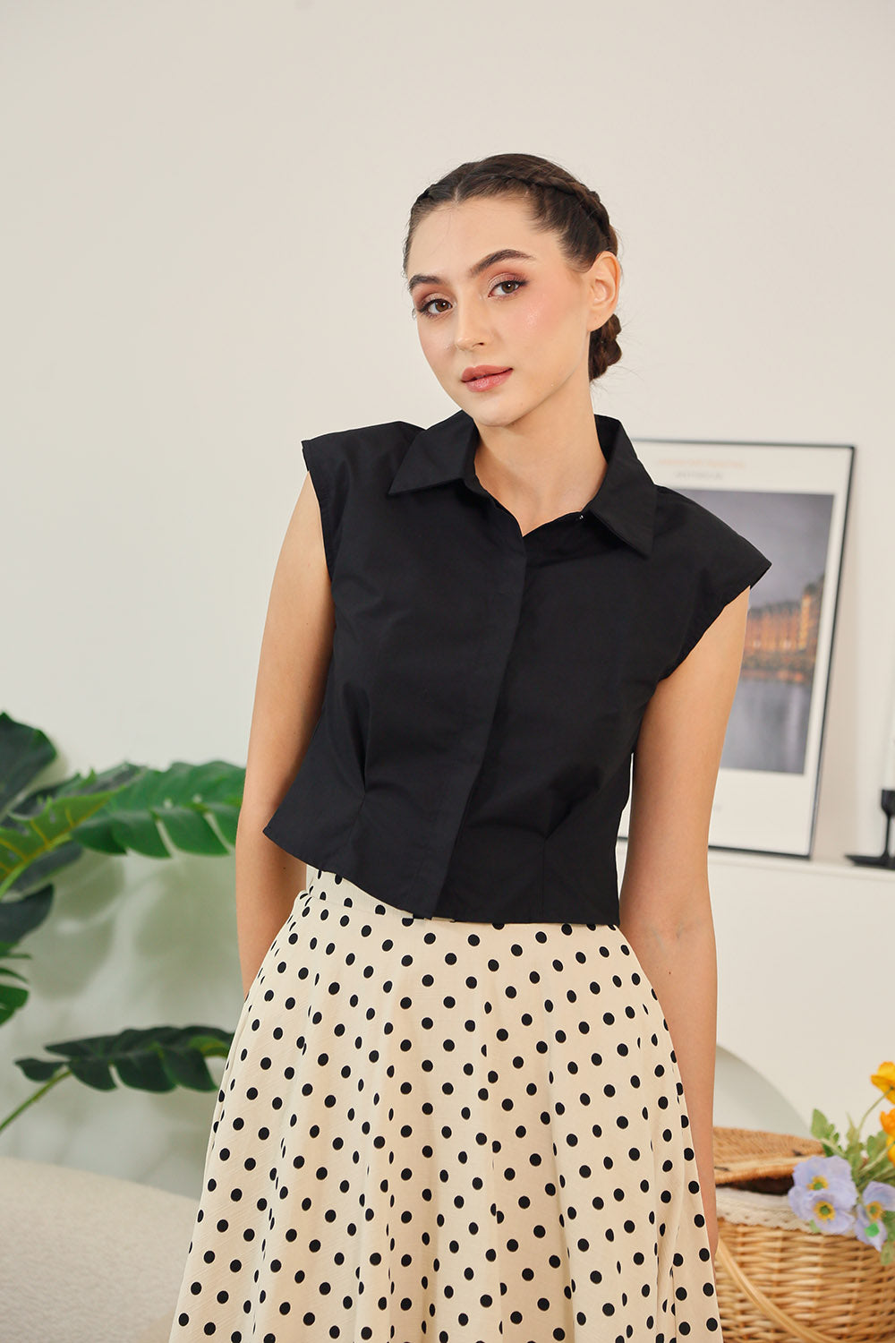 Effortlessly sleek and versatile, the Amira Sleeveless Shirt is a modern take on classic tailoring. Crafted from a comfortable cotton-blend fabric, it features a sharp collared neckline, a clean concealed button placket, and structured cap sleeves that add a polished touch. The cropped silhouette makes it perfect for pairing with high-waisted skirts or trousers, bringing balance to both casual and office-ready looks.