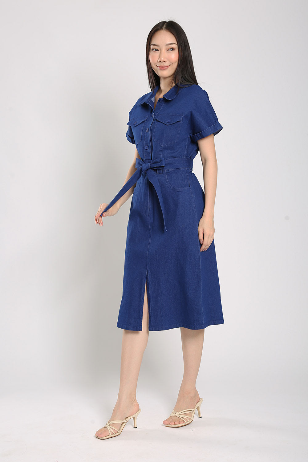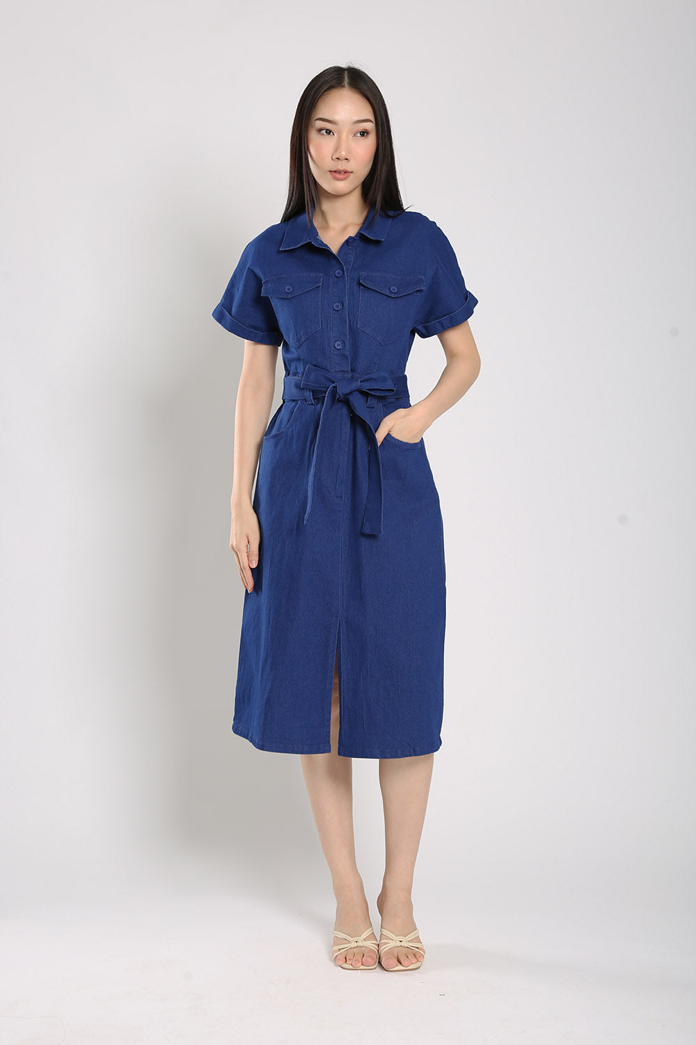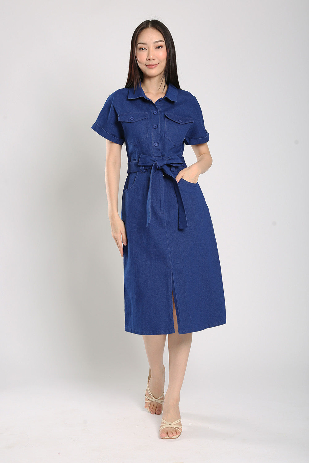 Effortless and versatile, the Cassia Midi Dress is a wardrobe staple made from soft blue denim. Designed with both front button and zip closure, this dress features flap chest pockets, functional side pockets, and an elasticised back waist for a comfortable fit. The detachable sash lets you define your shape, while the midi length and front slit offer ease of movement. Unlined for breathability and easy layering, it's perfect for laid-back weekends or casual workdays.