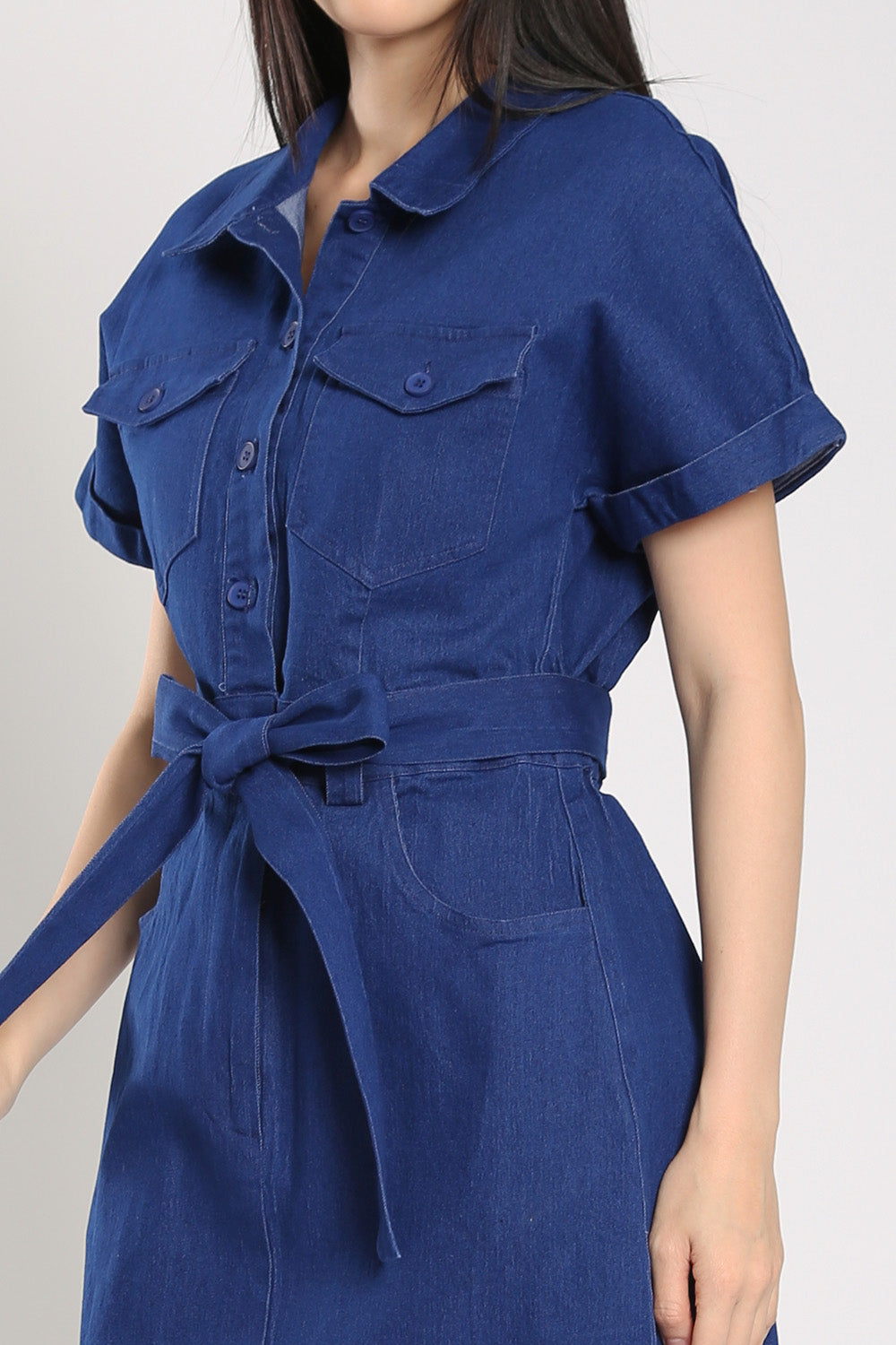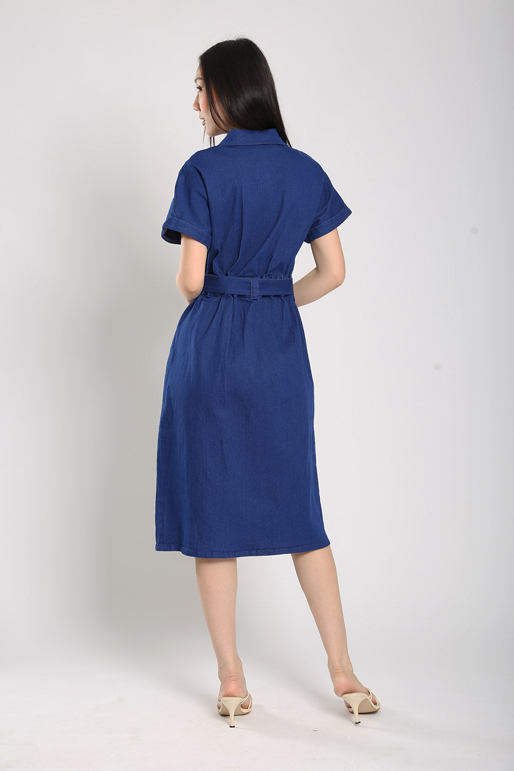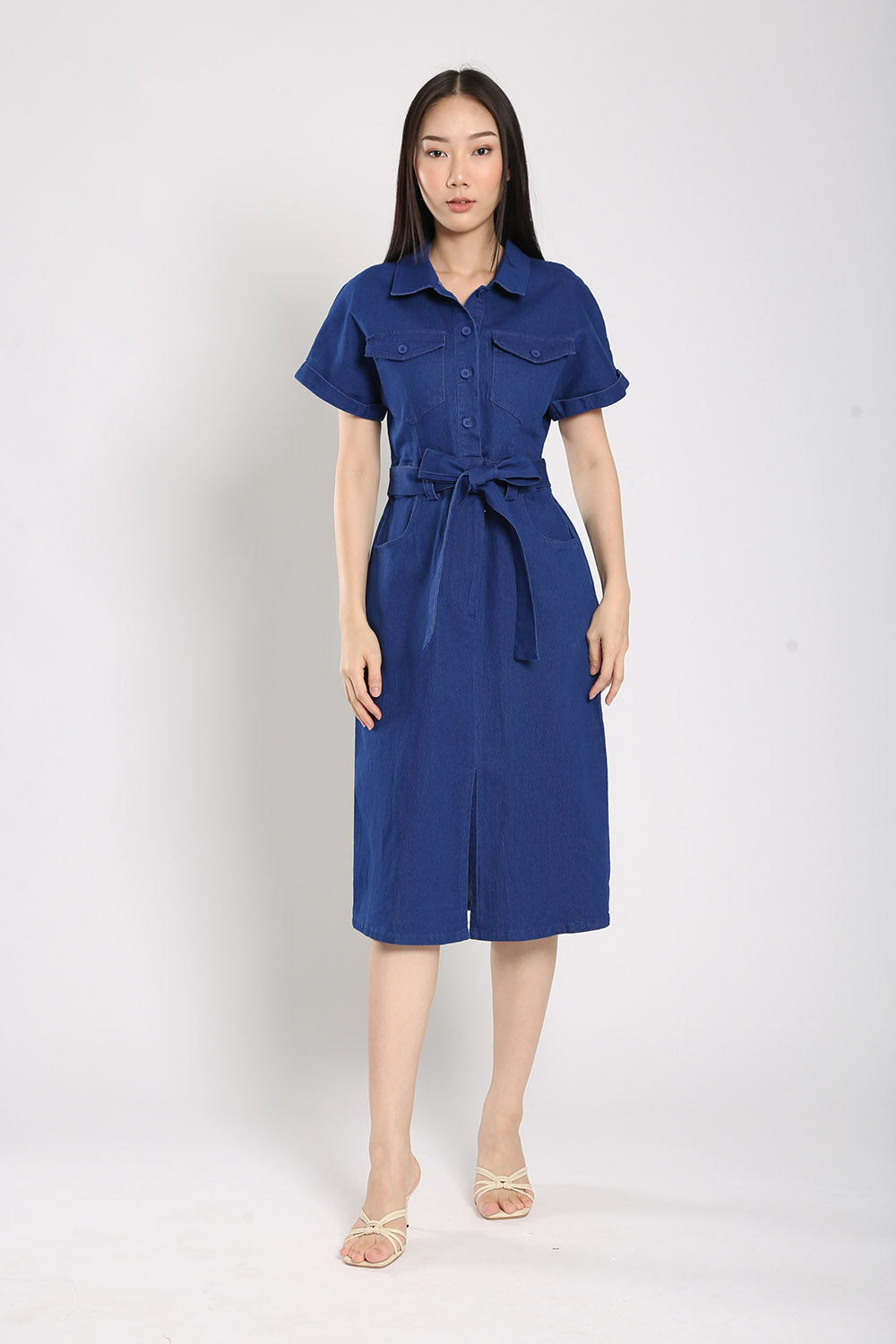 Effortless and versatile, the Cassia Midi Dress is a wardrobe staple made from soft blue denim. Designed with both front button and zip closure, this dress features flap chest pockets, functional side pockets, and an elasticised back waist for a comfortable fit. The detachable sash lets you define your shape, while the midi length and front slit offer ease of movement. Unlined for breathability and easy layering, it's perfect for laid-back weekends or casual workdays.