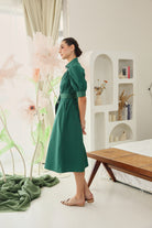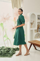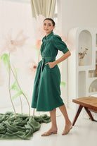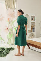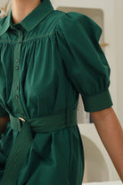 The Clarissa Belted Shirt Dress in Emerald Green is a timeless blend of elegance and comfort. Made from premium cotton with full lining, it provides a breathable yet structured feel, ensuring ease of wear throughout the day. The classic button-down shirt design, complemented by statement puff sleeves, adds a refined and feminine touch. With a midi-length silhouette, this dress offers effortless styling for various occasions.